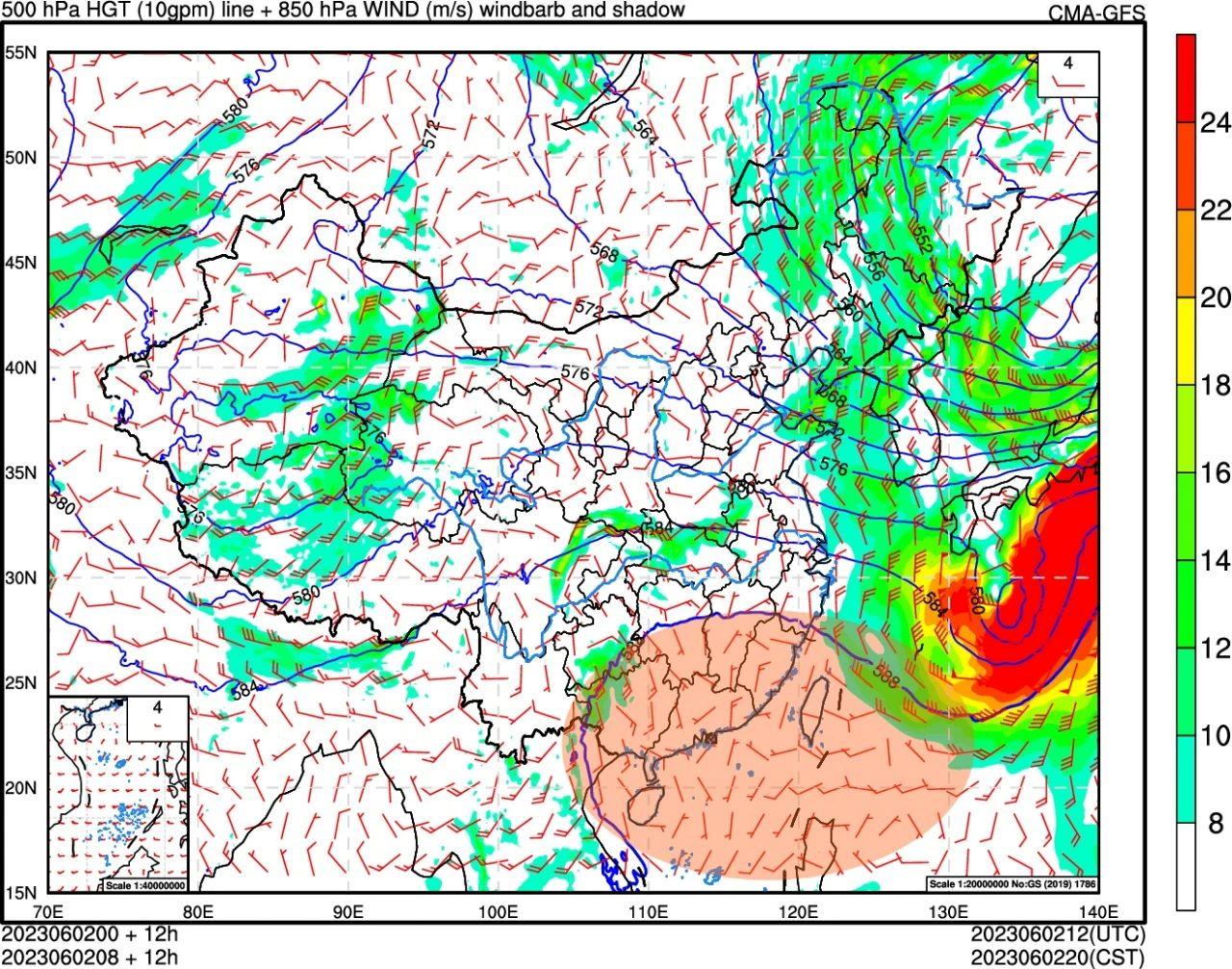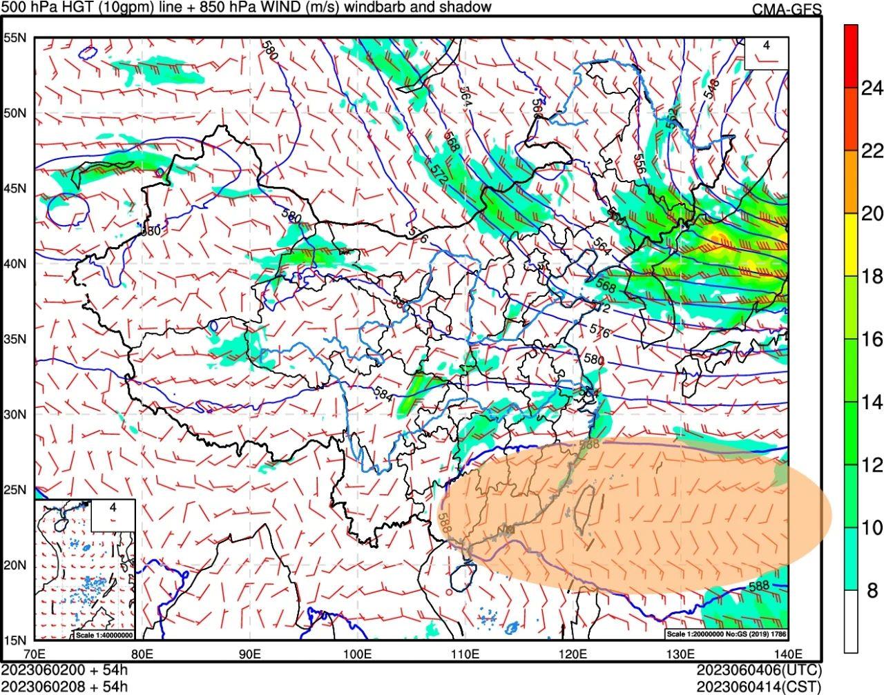 ▲从6月2日、4日500hPa高度场上可见副高主体位置大致位于橙圈区域。
