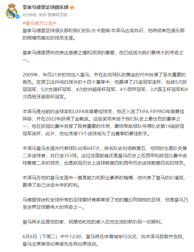 当地时间4日,皇家马德里足球俱乐部在官网宣布,队中的法国籍球员卡里姆·本泽马将在本赛季结束后离开俱乐部,本泽马与皇马的合同本赛季结束后到期,双方在协商后决定不再续约。