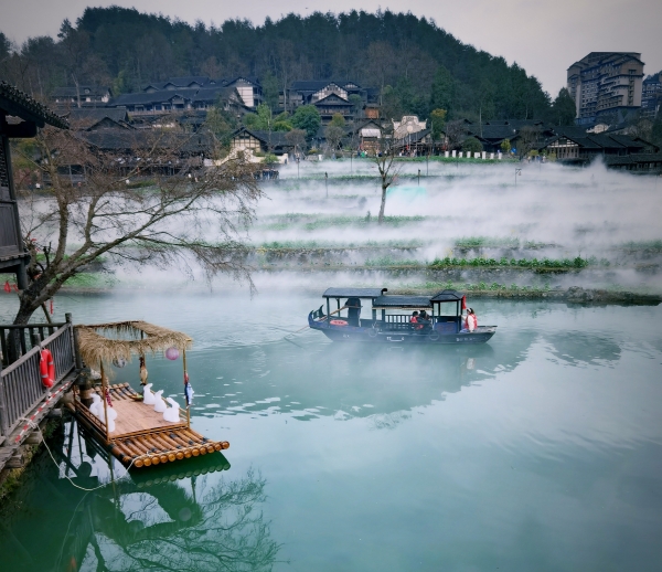 芒种至,盛夏始。在遵义市播州区乌江寨古村落,层层叠叠的梯田,水雾弥漫,烟波浩渺,船在雾中行,人在景中游,好一幅美丽的乡村画卷。(贵州省遵义市播州区纪委监委供 陈岑 摄)