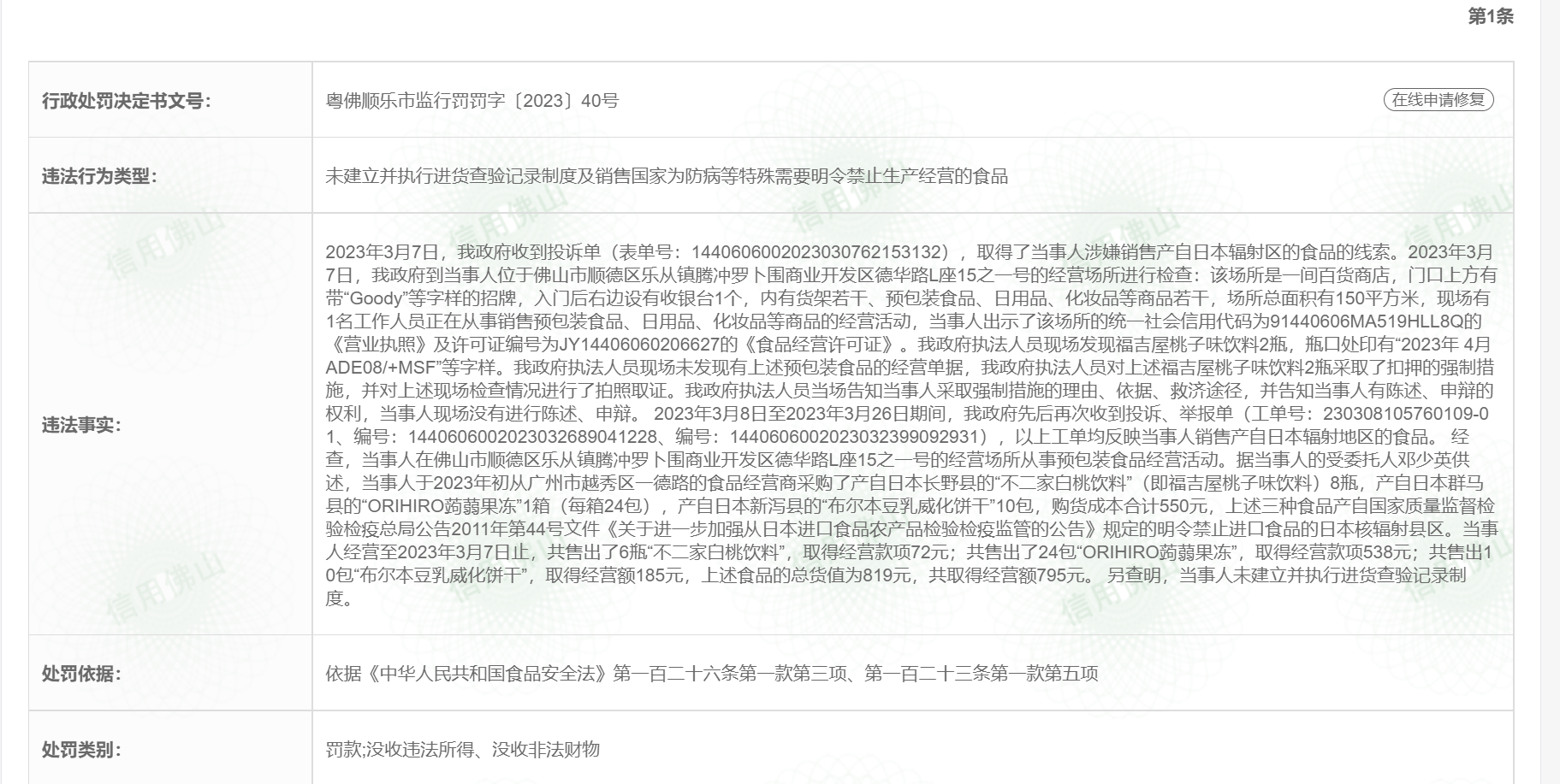 据信用中国消息,广东佛山顺德区汇洋行百货有限公司(以下简称“汇洋行百货”)因违法销售日本辐射区食品,日前被佛山市顺德区乐从镇政府处以罚款1万元、没收违法所得等处罚。