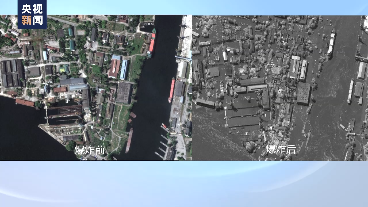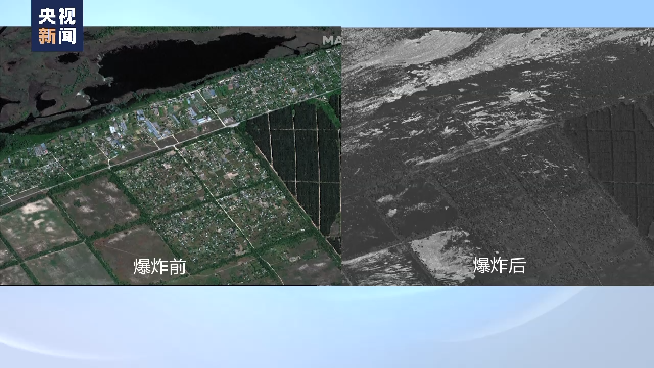 卫星对比图像显示,由于大坝被破坏,河水漫灌到城市中,多处道路、河流沿岸等低洼地带被水淹没。