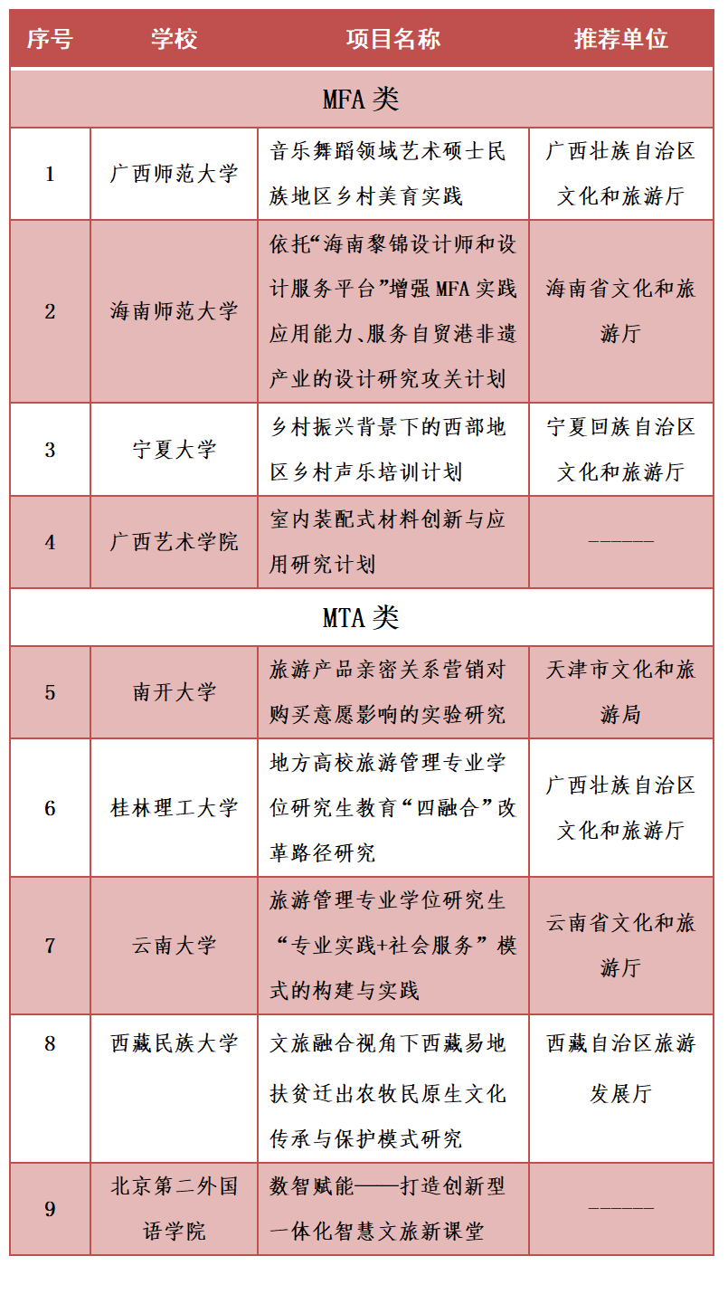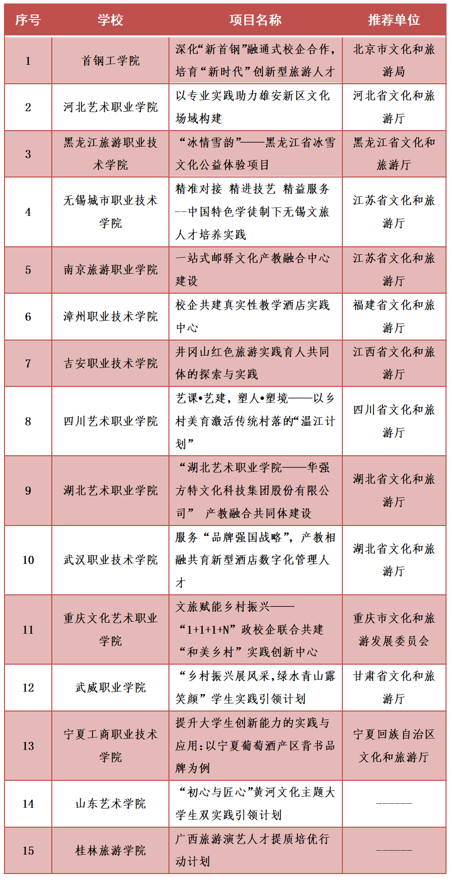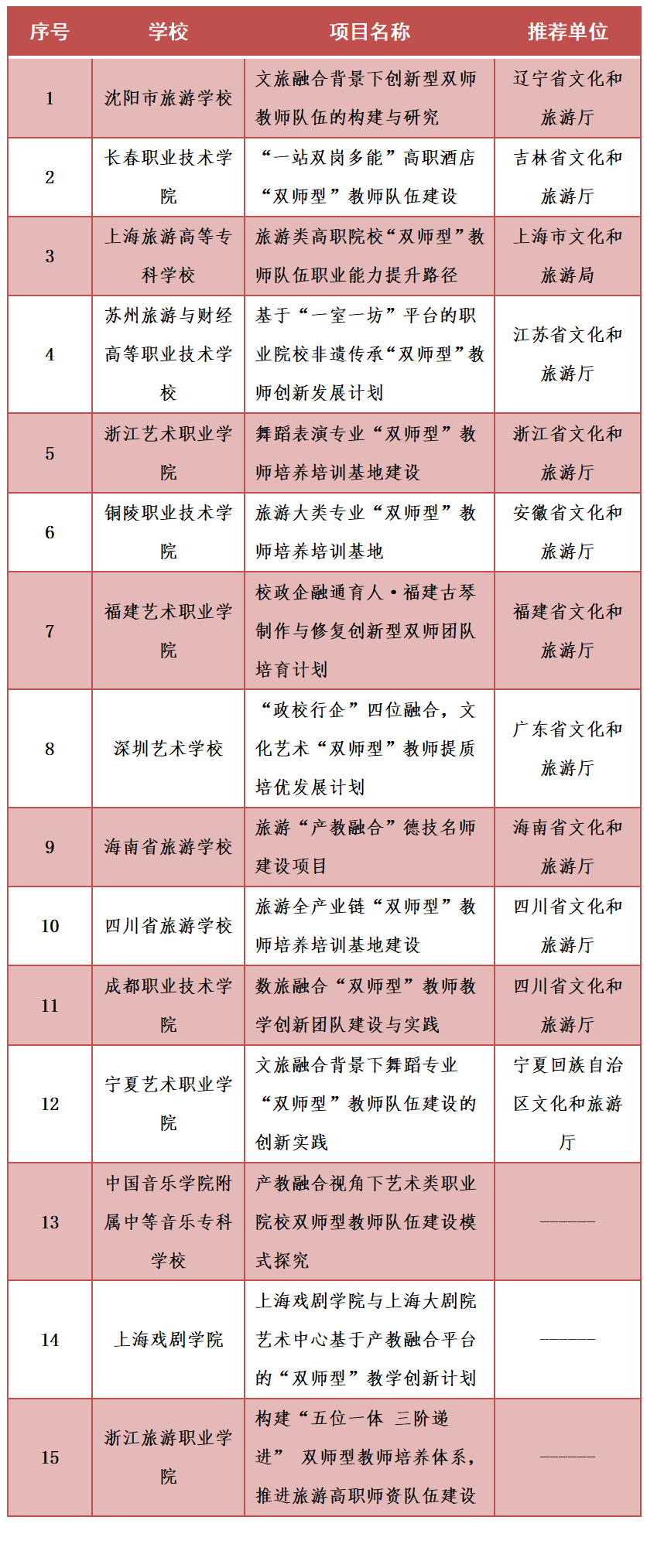 按照《文化和旅游部办公厅关于实施2023年全国文化艺术职业教育和旅游职业教育提质培优行动计划的通知》要求,经申报、专家评审和公示,文化和旅游部确定了2023年全国文化艺术职业教育和旅游职业教育提质培优行动计划支持名单。