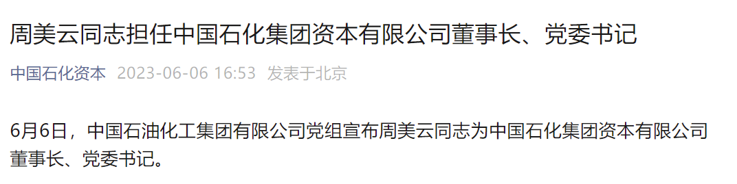 6月6日,中国石油化工集团有限公司党组宣布周美云同志为中国石化集团资本有限公司董事长、党委书记。