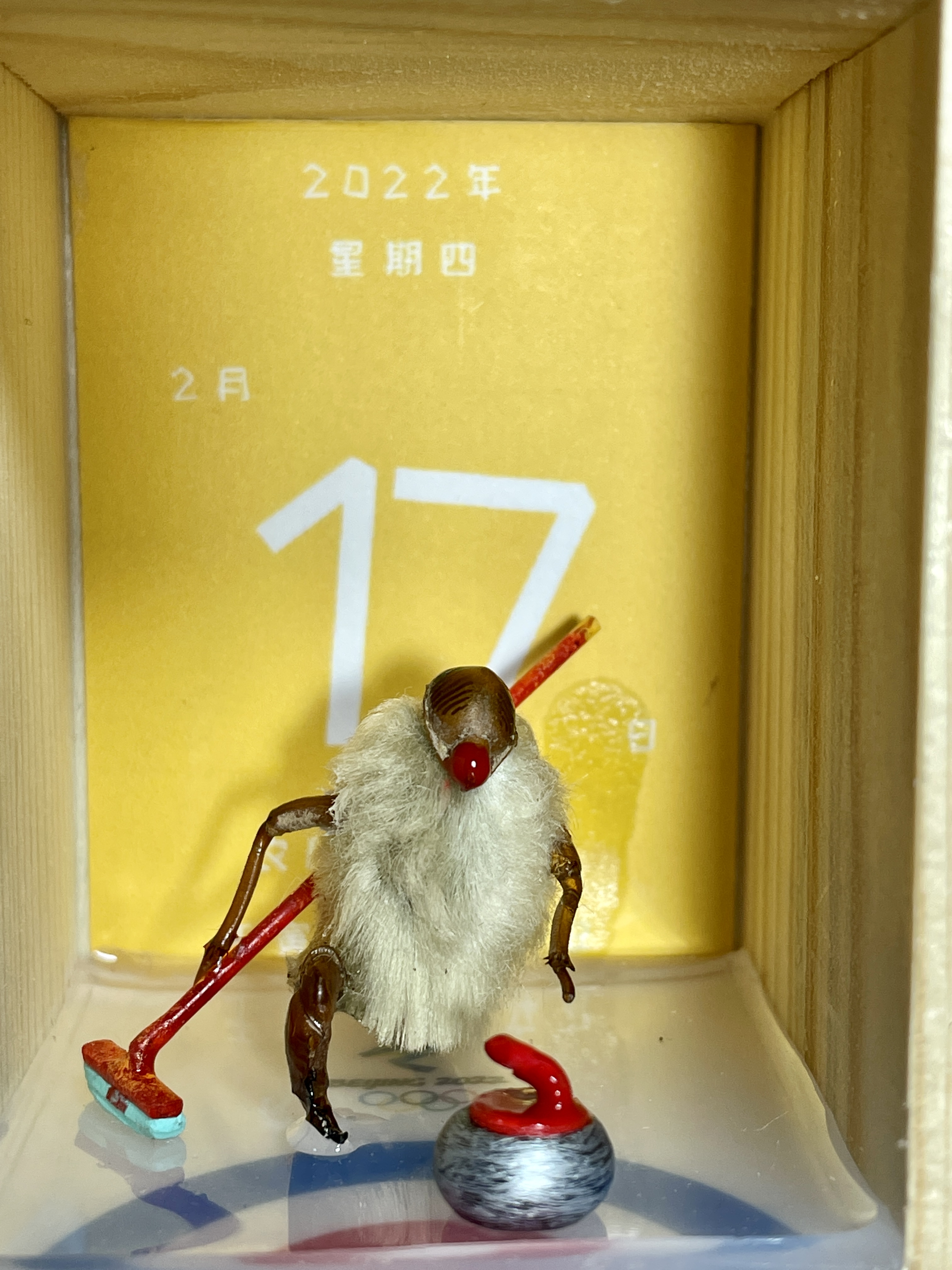 韩僖僖介绍,老手艺人大多用牙签、木棍、废报纸来还原毛猴场景中的道具,早年有着做模型沙盘基础的韩僖僖,创新地将现代科技与传统技艺结合,使道具更逼真、更接地气。比如:3d打印的头盔、茶壶,滴胶还原的冰面,激光雕刻的冬奥“大雪花”等等。生活中随处可见的物品也成了他的道具:卫生纸的内圈做钢架雪车的滑道,冰壶扫冰的刷子用的是免钉胶……