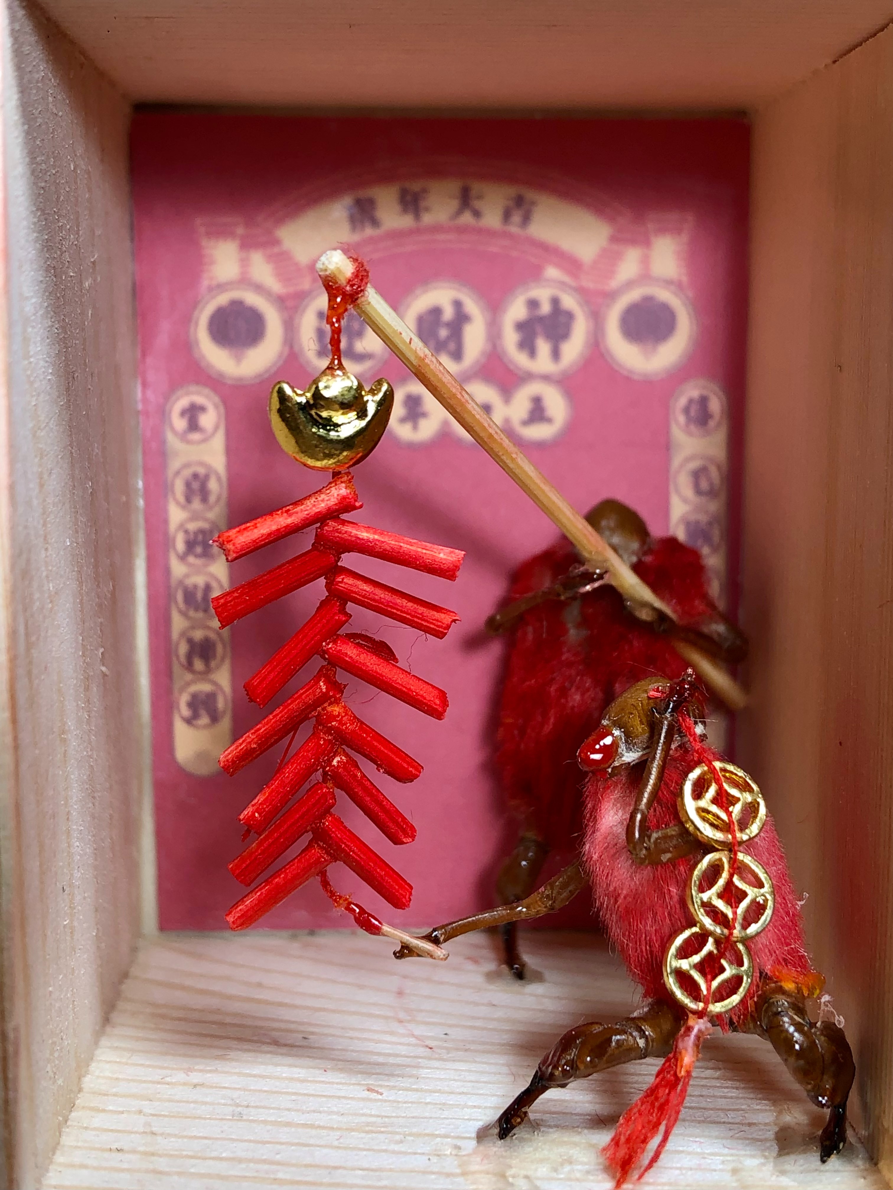 韩僖僖师从毛猴技艺代表性传承人姜守煜,他们这一派做的毛猴没有眼睛、表情,擅长用肢体语言来表达喜怒哀乐。韩僖僖说:“比如放鞭炮的毛猴,左腿蹲着弯曲度很大,右腿是伸长出去的,毛猴的大腿还要分出左右。这就要在成百上千个蝉蜕中找到合适的角度。想让拟人化的毛猴活起来,真得费一番工夫。”