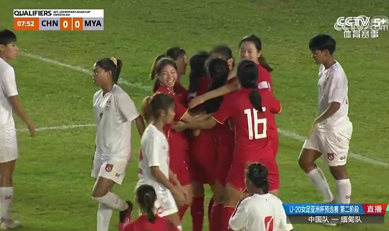 中国U20女足庆祝首个进球。直播截图
