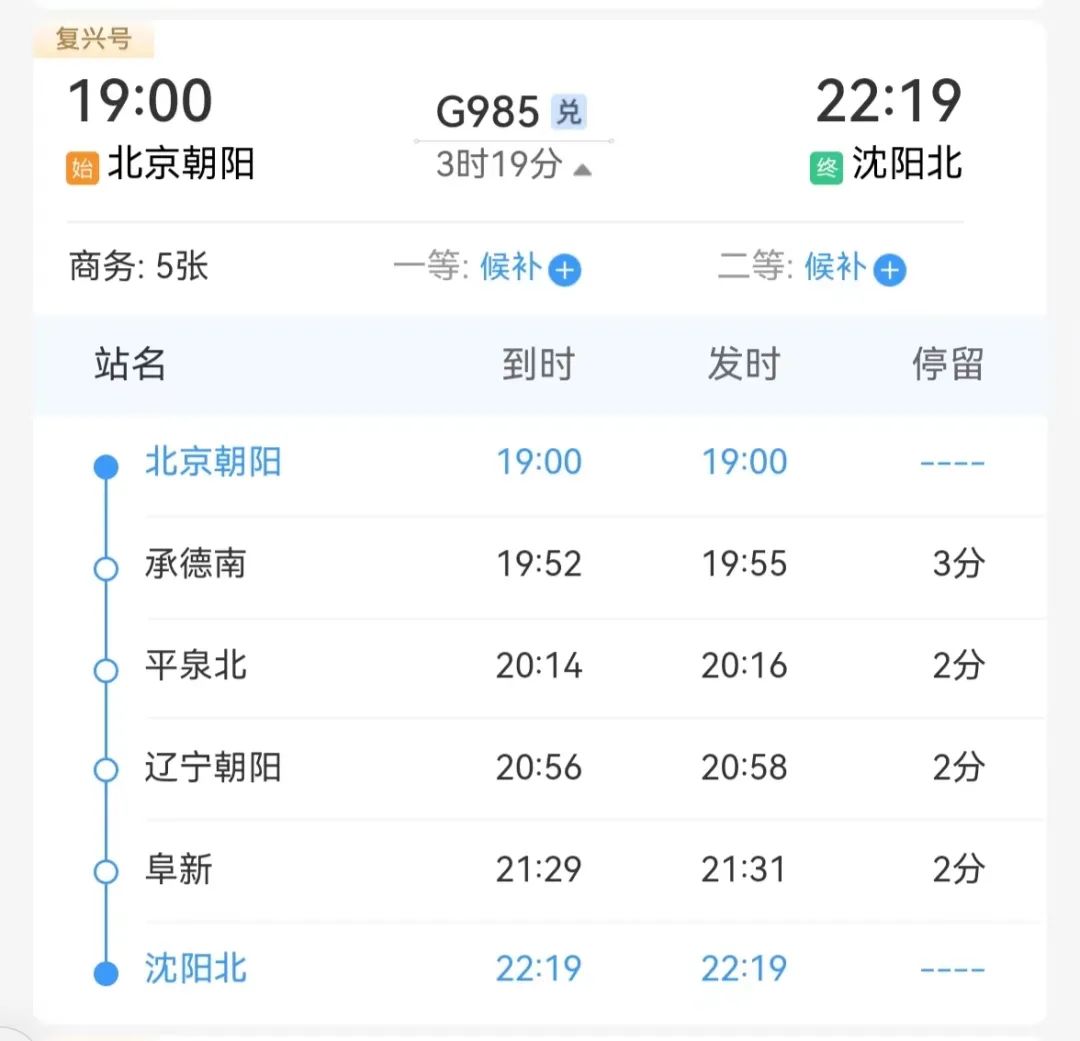 2021年1月,随着京哈高铁京沈段开通运营,G985次复兴号列车正式开行。这趟车每天19时从北京朝阳站出发,22时19分抵达沈阳北站,全程3小时19分钟,一直深受旅客喜爱。