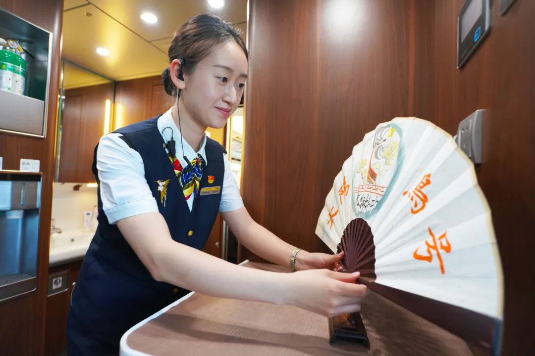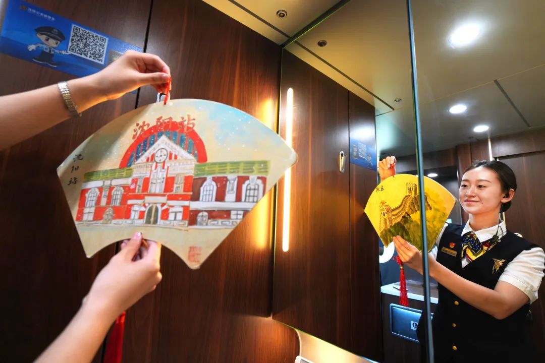 他们发挥特长与才艺,绘制扇子、制作手工插花,在车厢悬挂中国结和香包,将列车环境装点一新。