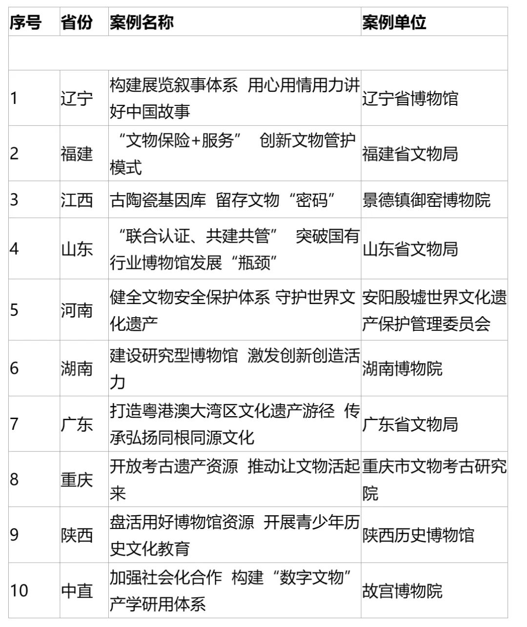 申报案例体现了近年来文物工作的积极探索:在推动文物工作融入国家大局、助推区域发展战略方面有创新举措;在文物资源免费共享、素材共用、知识共研、共同开发方面有显著进步;在破解基层人才缺乏的机制障碍,激励人才培养方面取得引领性成果;在推动公共文化服务均等化标准化便捷化、赋能经济社会发展方面有探索性进步;在主动策划选题,以国际表达讲好中国故事,展现中国话语和中国叙事体系方面有开拓性实践。
