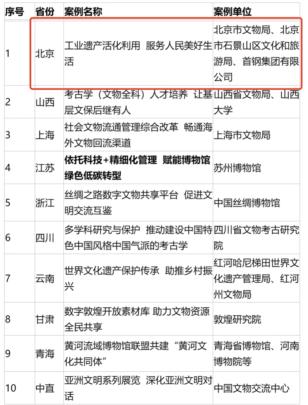 6月10日,在2023年文化和自然遗产日主场城市活动开幕式上,国家文物局公布了文物事业高质量发展推介案例名单。《工业遗产活化利用 服务人民美好生活》等10个项目获评十佳案例,《构建展览叙事体系 用心用情用力讲好中国故事》等10个项目获评入围案例。这是国家文物局首次开展文物事业高质量发展案例遴选推介活动。
