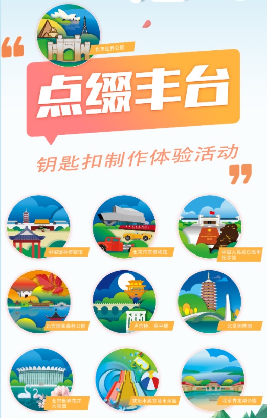 丰台元素钥匙扣,你值得拥有!“点缀丰台”钥匙扣制作体验活动以丰台文旅资源为蓝本定制专属丰台图案钥匙扣,在手工老师的指导下,参与者可现场参与钥匙扣的组装制作,完成品将作为活动纪念品赠送给体验游客。