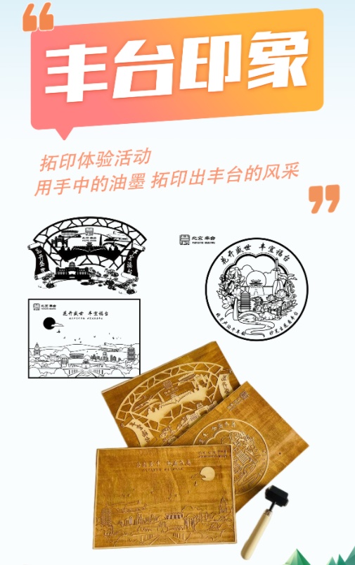用手中的油墨,拓印出丰台的风采!“丰台印象”拓印体验活动将丰台文旅特色景区标志、元素作为拓印题材。由专业老师讲解拓板、滚筒、宣纸、墨汁等拓印工具的作用和使用方法。并指导参与者依次进行“蘸墨、上墨、拓印”等体验,拓印出的成品将作为纪念品赠送给体验游客。