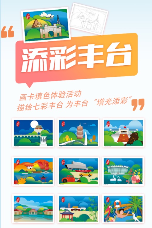 描绘七彩丰台,为丰台“增光添彩”的机会来了!“添彩丰台”画卡填色体验活动将丰台景致化为线稿画卡,参与者可现场用手中的彩笔为画卡填色,最终完成独一无二的“七彩丰台”。这份“爱丰台”的心,将成为一份美好的旅游记忆。