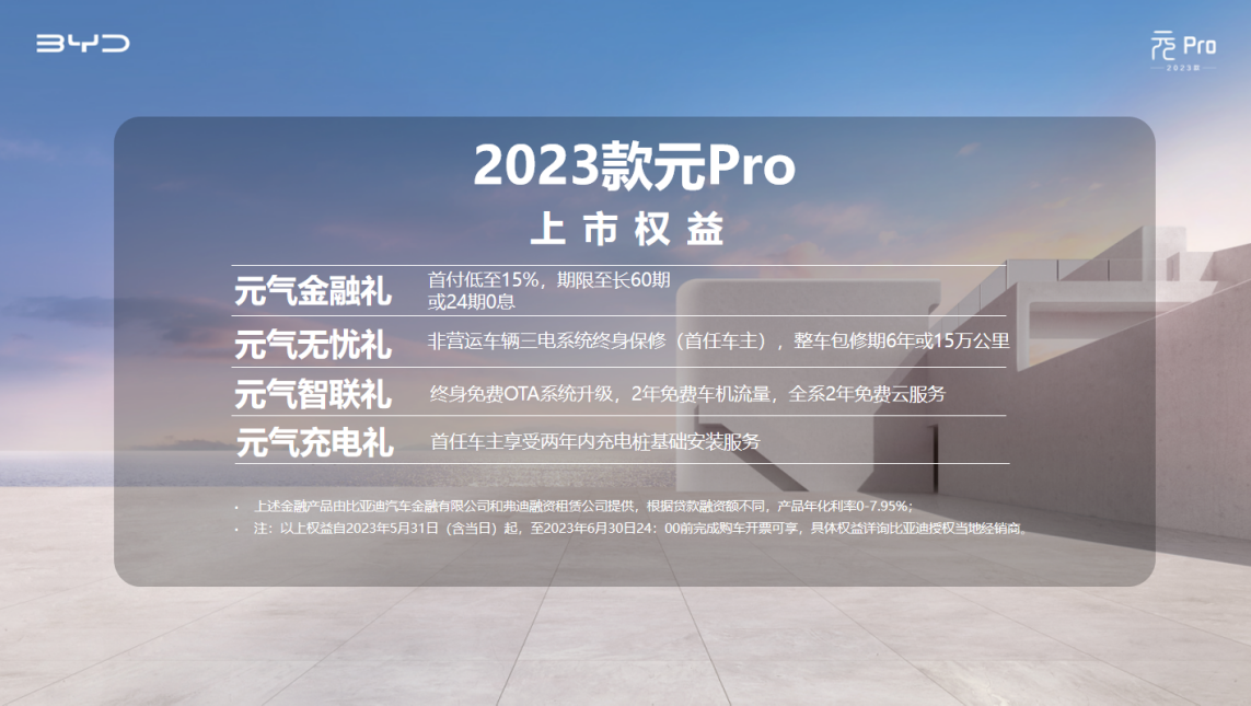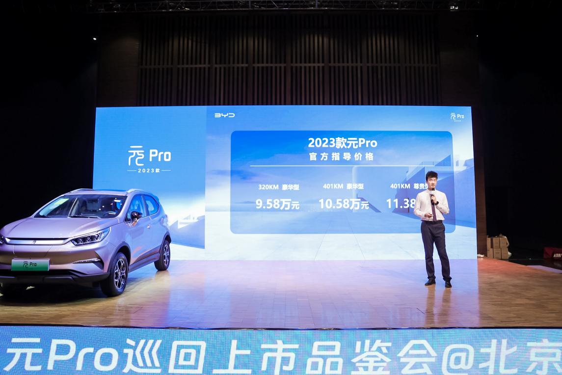 6月9日,比亚迪2023款元Pro在北京上市发布,共推出3款两种续航版本车型,官方指导价为9.58万-11.38万元。