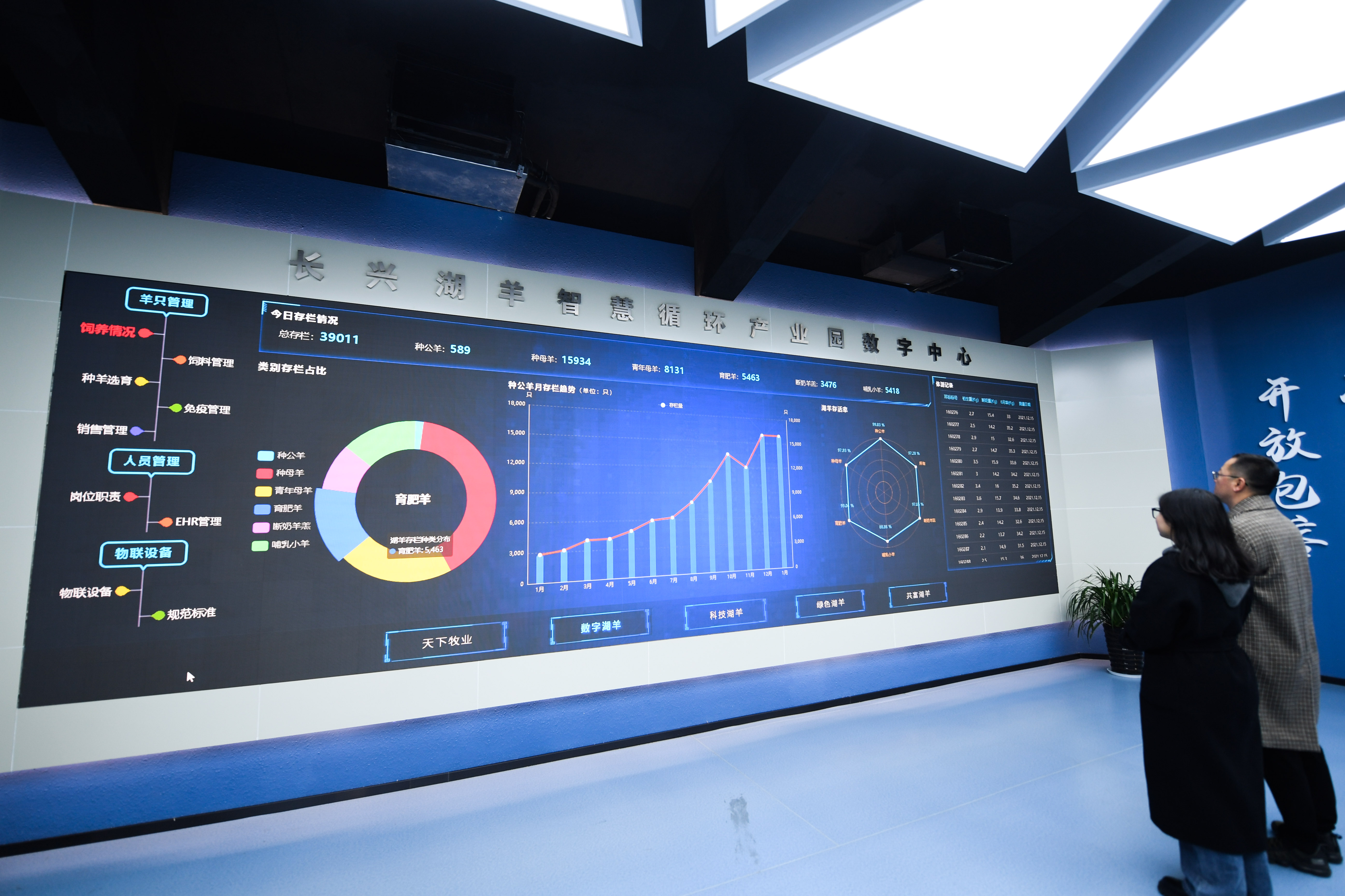 浙江省湖州市长兴县吕山乡湖羊智慧循环产业园里的数字大屏实时显示湖羊的各类监控数据(2022年1月6日摄)。新华社记者 徐昱 摄