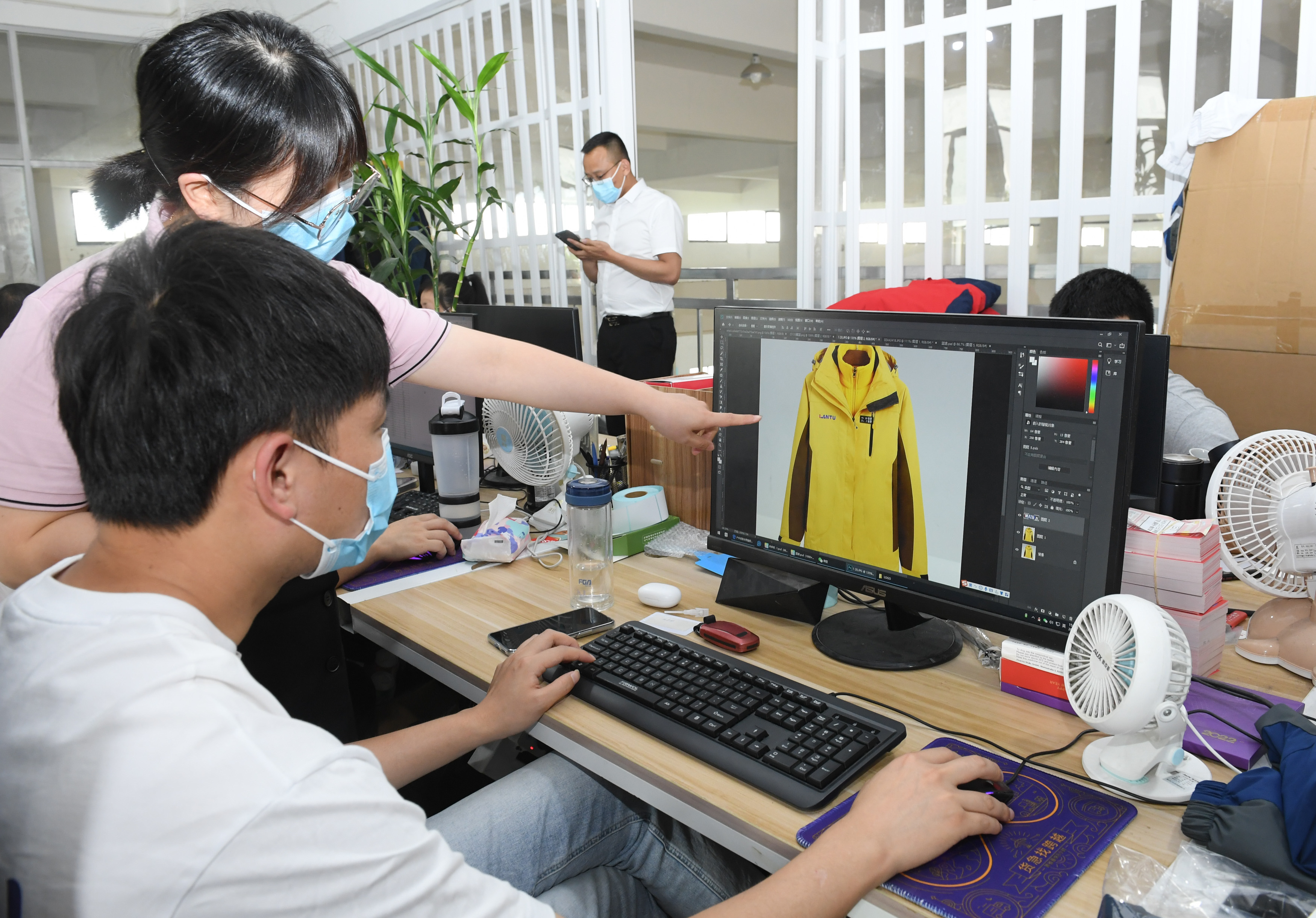 在浙江省台州市三门县的一家户外用品企业,工作人员在讨论一款冲锋衣的设计(2022年6月14日摄)。新华社记者 翁忻旸 摄