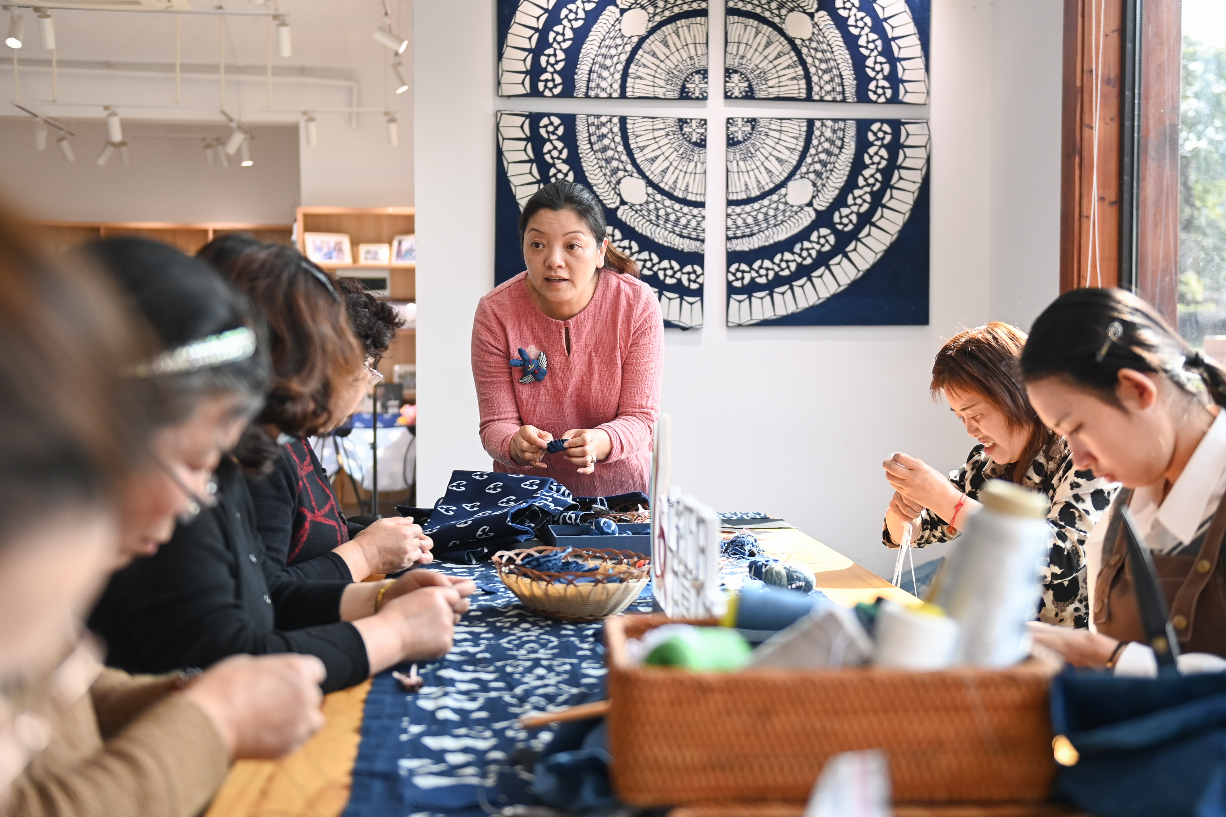 在奉化区西坞街道雷山村“七彩巧妇”共富工坊,宁波市非物质文化遗产蓝印花布印染技艺代表性传承人张剑峰(中)向村民演示手工饰品的制作方法(2023年3月8日摄)。新华社记者 黄宗治 摄