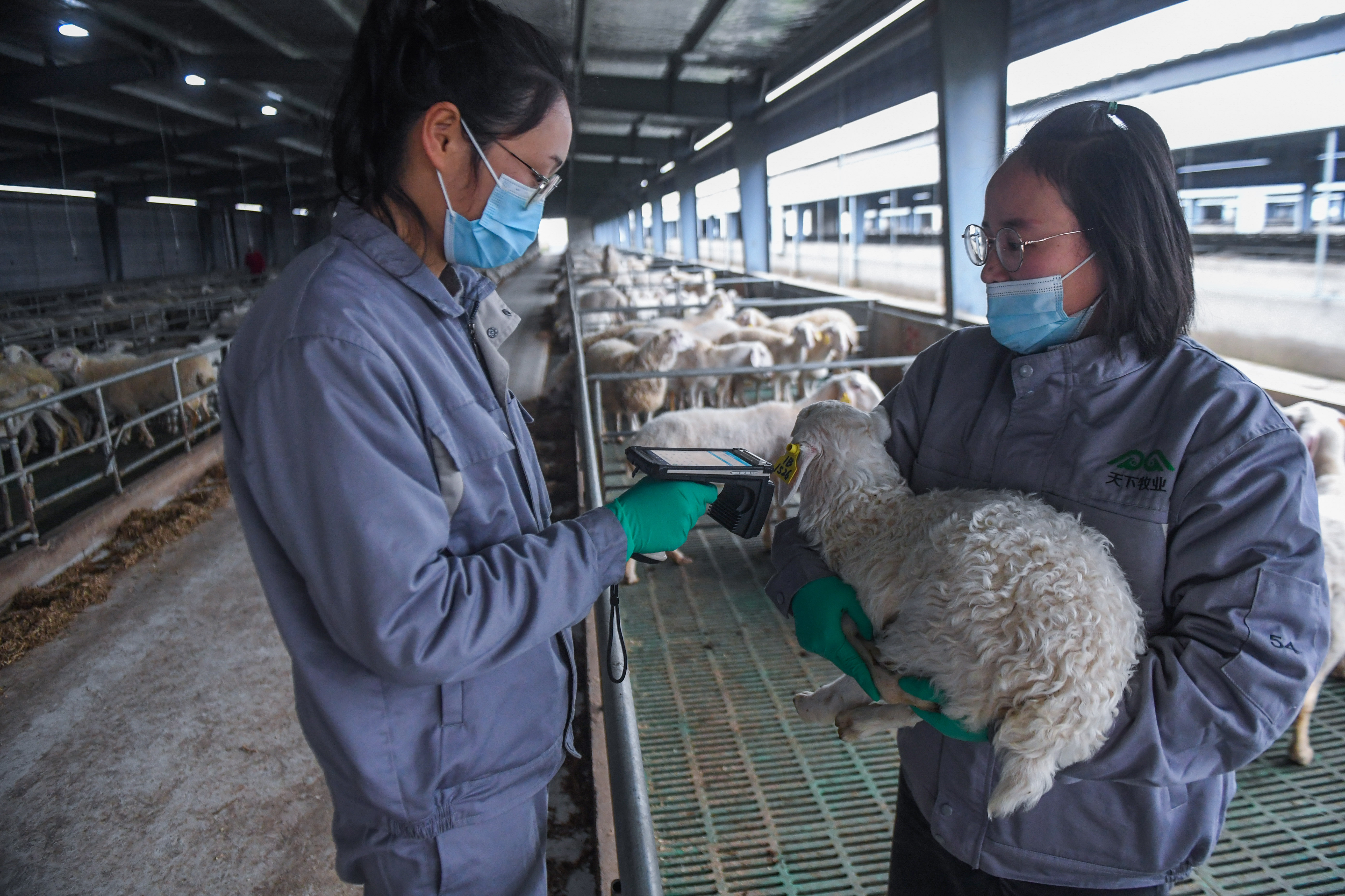 浙江省湖州市长兴县吕山乡湖羊智慧循环产业园的工作人员在扫描湖羊幼仔耳朵上的数字芯片(2022年1月6日摄)。新华社记者 徐昱 摄