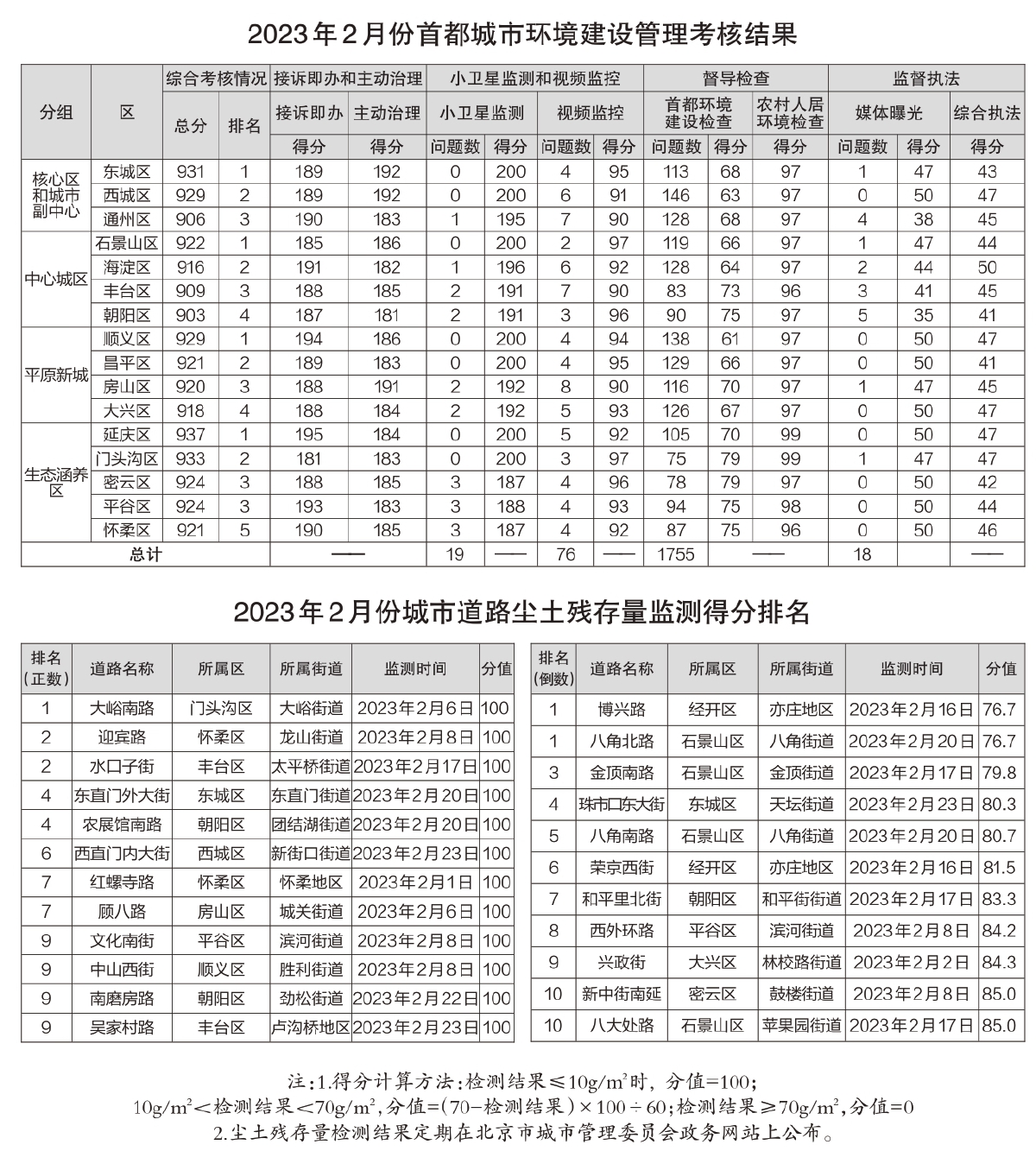 自2023年2月份起,首都环境建设管理办围绕“接诉即办”和主动治理(400分)、小卫星监测和视频监控(300分)、督导检查(200分)、监督执法(100分)四个方面,采取千分制扣分开展考核,并按综合考核得分进行排名。
