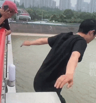 记者给他看了当时别人拍下的“跳江”视频。他仔细盯着,沉默了几秒后说,“我是真的有点怂,哪怕鞋子,眼镜都脱了,还是怕的,这么高谁不怕啊?”