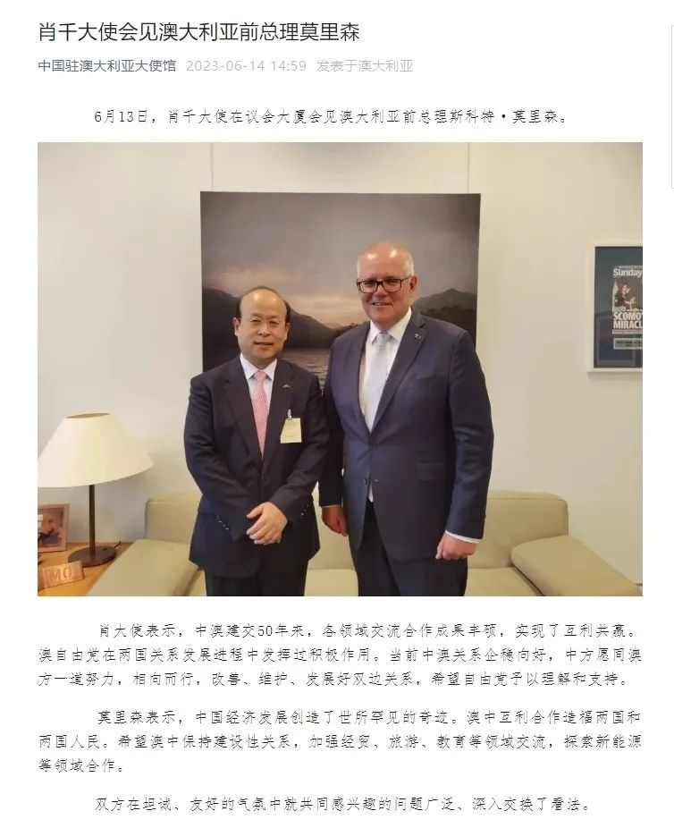 6月14日,我国驻澳大利亚大使馆的官方微信账号发布了一则“很有意思”的消息,内容是13日,我驻澳大利亚大使肖千在澳大利亚的议会大厦会见了澳大利亚前总理斯科特·莫里森,而且双方聊得还挺不错。