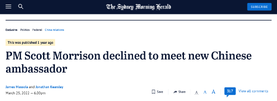 然而,去年3月在面对肖千大使提出的会面申请时,当时还是澳大利亚总理的莫里森却拒绝了肖大使,最后是派澳大利亚时任外长玛丽斯·佩恩见了肖大使,而且从当时澳大利亚的媒体来看,佩恩并没有拿出什么想改善中澳关系的诚意。