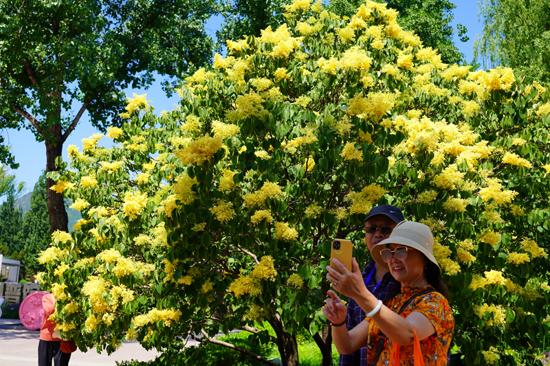 “有金灿灿的丁香花,太难得一见了!”走进国家植物园北园的丁香园,丝丝缕缕的清香扑面而来。远远望去,一簇簇金黄色花朵在阳光下绚丽多姿,引来了无数游客打卡拍照。