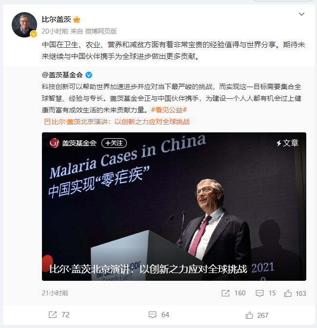 与此同时,比尔∙盖茨也在微博中指出,中国在卫生、农业、营养和减贫方面有着非常宝贵的经验值得与世界分享。期待未来继续与中国伙伴携手为全球进步做出更多贡献。