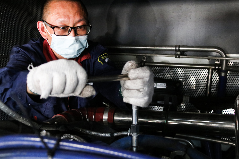 保修分公司十五车间的检修地沟里闷热难耐。任永刚和宋磊背靠坚硬的水泥瓷砖、头顶公交车底盘,承受车辆部件散发的热量,犹如钻进烤箱。为了排查故障,维修工需要一直猫着腰、歪着头,换机油和检查更换传动、转向零部件及气路管线。“底盘检修大都是力气活,所以出汗出得非常多。一天下来,一升的矿泉水要喝3瓶。”任永刚说。