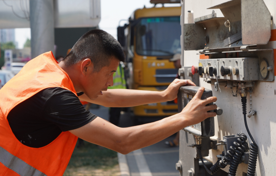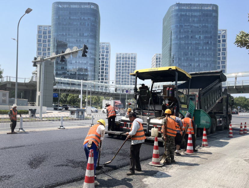 没等记者靠近“摊铺机”,就被工作人员一把拉了回来。“别太靠近这儿,刚洒下的沥青温度极高,崩到你身上就烫伤了。”记者注意到,即便体感如此热,为了不被烫伤,道路养护工人没有穿短衣短裤的。