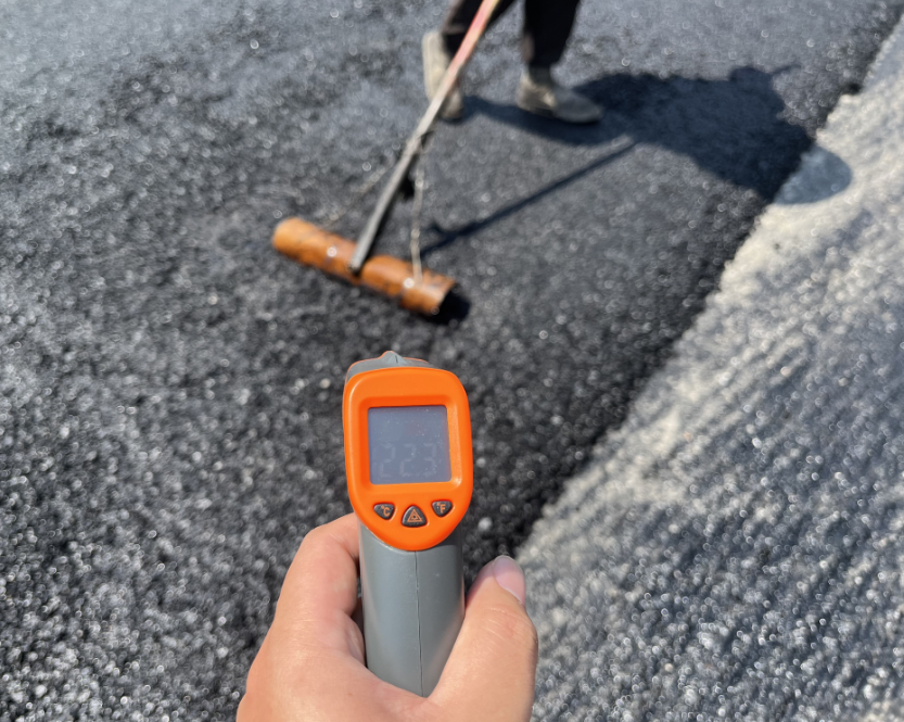 摊铺好后,在十几米宽的路面上,伴着阵阵轰鸣声,现场一大一小两辆压路机在路面上来回行驶,把沥青缝隙里的空气排出去碾轧密实。此时,郭振有和十多名工友在沥青路上走动,观察压实度,如果还不够平整,他们就继续用铁锹或铁铲将沥青压实。