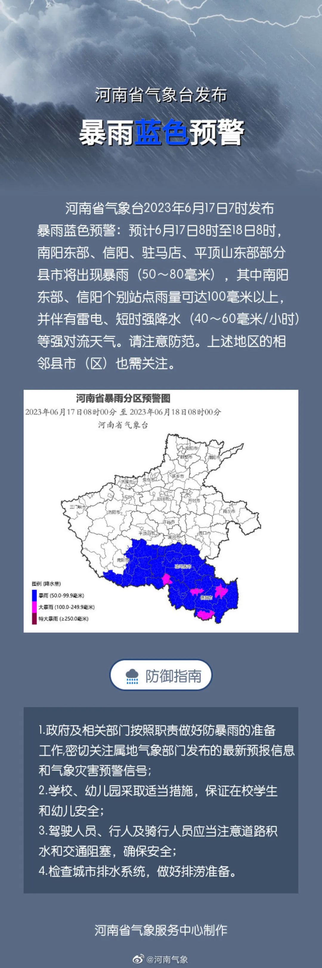 河南气象消息,河南省气象台2023年6月17日7时发布暴雨蓝色预警: