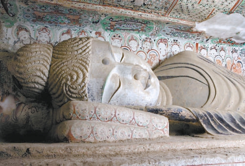 佛陀周身安详,焕发出慈悲之美和超脱之乐。一种内在的大光明境界令整个洞窟洋溢着一种神圣的光芒。佛陀的右手承托着脸,左臂自然地覆在左侧腰身,生动的臂膀和手指仿佛随时可以抬起来。佛陀似闭非闭的眼睛,微微含笑的嘴角显得非常自信,他好像对自己生前一切苦难的经历,所证得的无上的智慧成就感到无憾,感到宽慰。在涅槃到来的时刻,他要以绝对的从容和宁静给予世人无限的希望和信心。