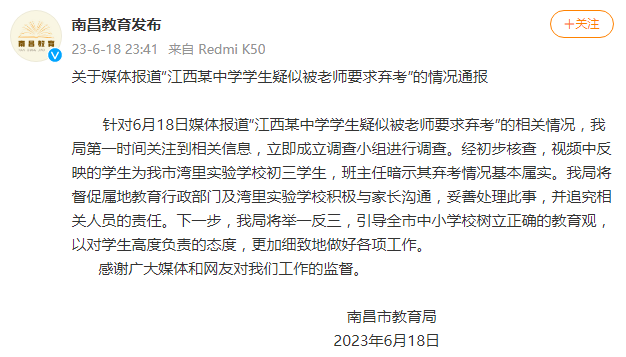 据江西省南昌市教育局官方微博通报,针对6月18日媒体报道“江西某中学学生疑似被老师要求弃考”的相关情况,我局第一时间关注到相关信息,立即成立调查小组进行调查。经初步核查,视频中反映的学生为我市湾里实验学校初三学生,班主任暗示其弃考情况基本属实。我局将督促属地教育行政部门及湾里实验学校积极与家长沟通,妥善处理此事,并追究相关人员的责任。下一步,我局将举一反三,引导全市中小学校树立正确的教育观,以对学生高度负责的态度,更加细致地做好各项工作。