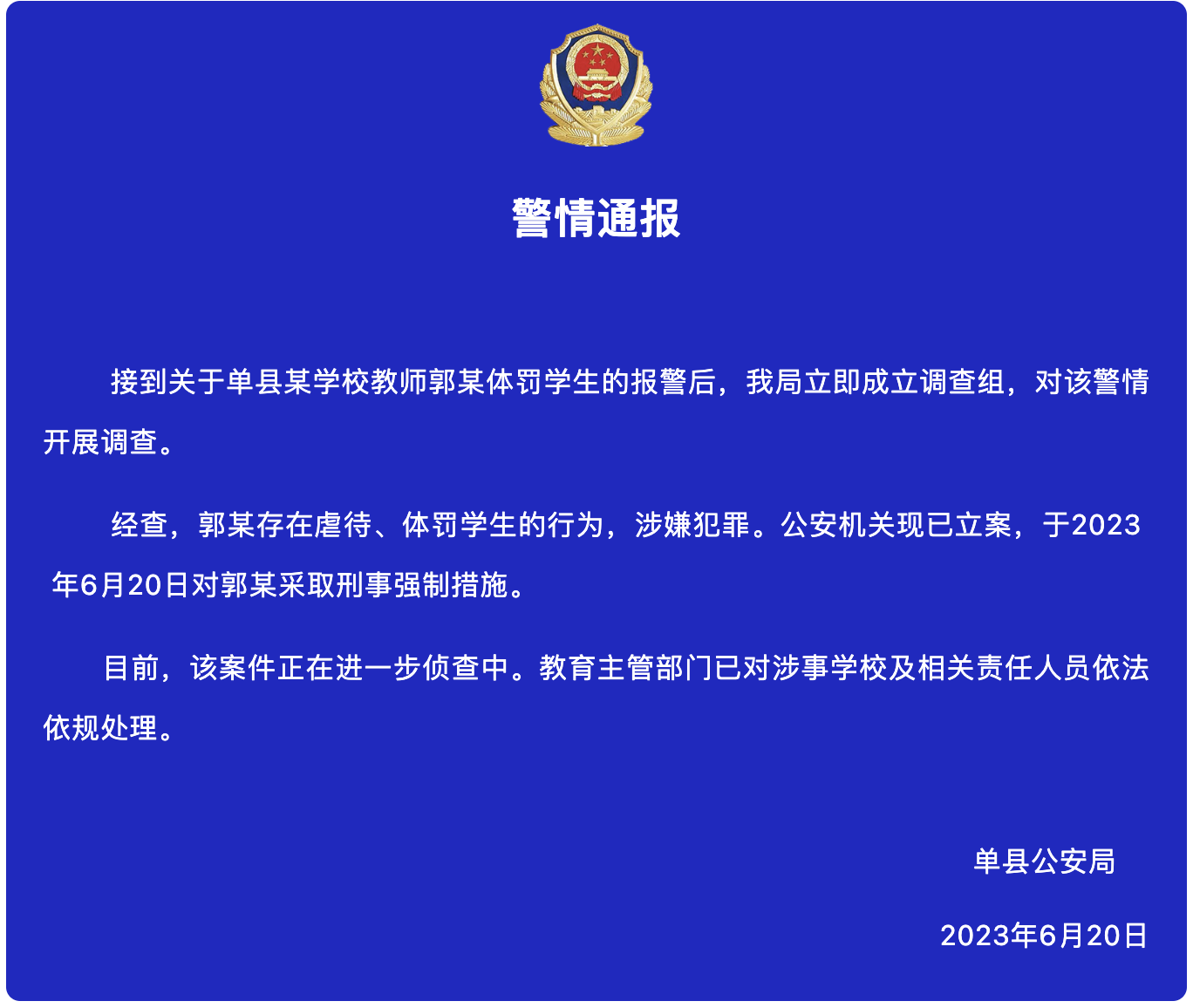 接到关于山东菏泽单县某学校教师郭某体罚学生的报警后,我局立即成立调查组,对该警情开展调查。