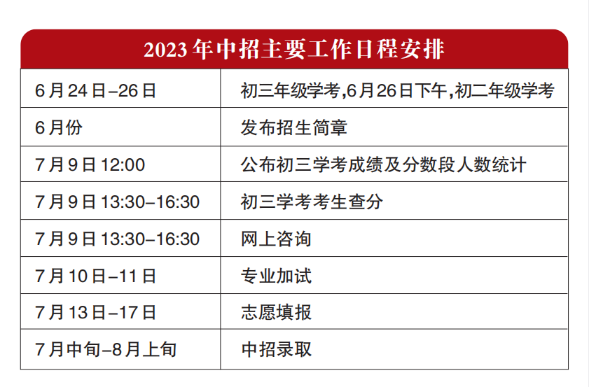 中招办相关负责人表示,中招仍然实行考后知分填报志愿,按照提前招生、校额到校招生、统一招生三个阶段进行录取,被前一阶段录取的考生不再参加后一阶段的录取。统一招生录取结束后,相关学校公布未完成的招生计划,未被录取的考生可填报征集志愿进行录取。其中,普通高中部分招生类型可以参加提前招生录取;高端技术技能人才贯通培养项目可根据本校实际,安排部分招生计划参加提前招生录取。校额到校招生包括校额到校和市级统筹,校额到校采取校内选拔方式。统一招生按照考生总成绩,从高分到低分,依照志愿顺序,择优录取。