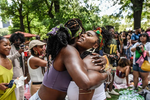 6月18日,美国纽约市。两名非洲裔女子在庆祝“六月节”的活动上相拥而泣。(图片来源:美国全国广播公司)