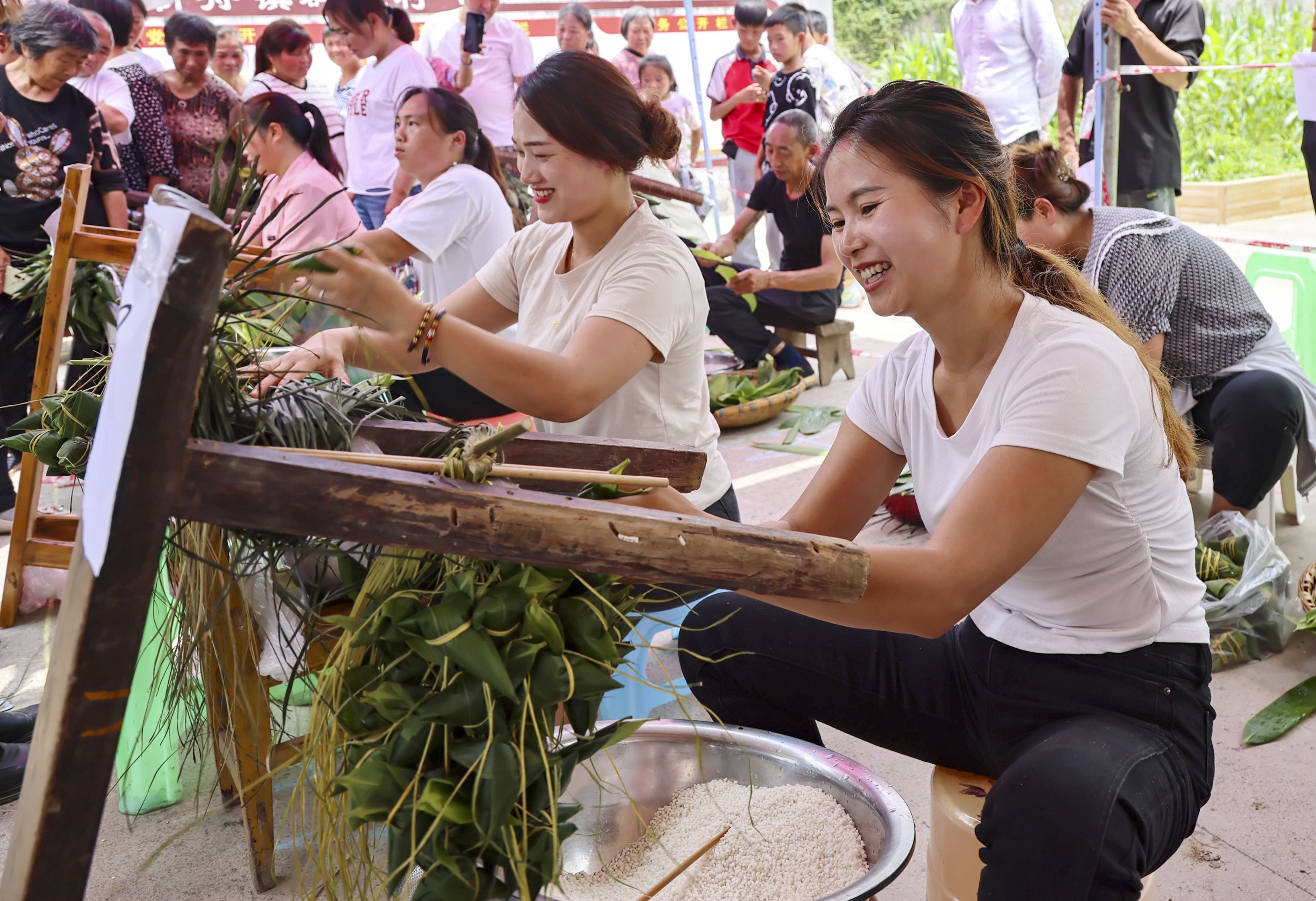 6月17日,在贵州省遵义市新蒲新区新舟镇群乐村举行的“粽香迎端午,增进邻里情”活动中,村民参加包粽子比赛。新华社发(简垦 摄)