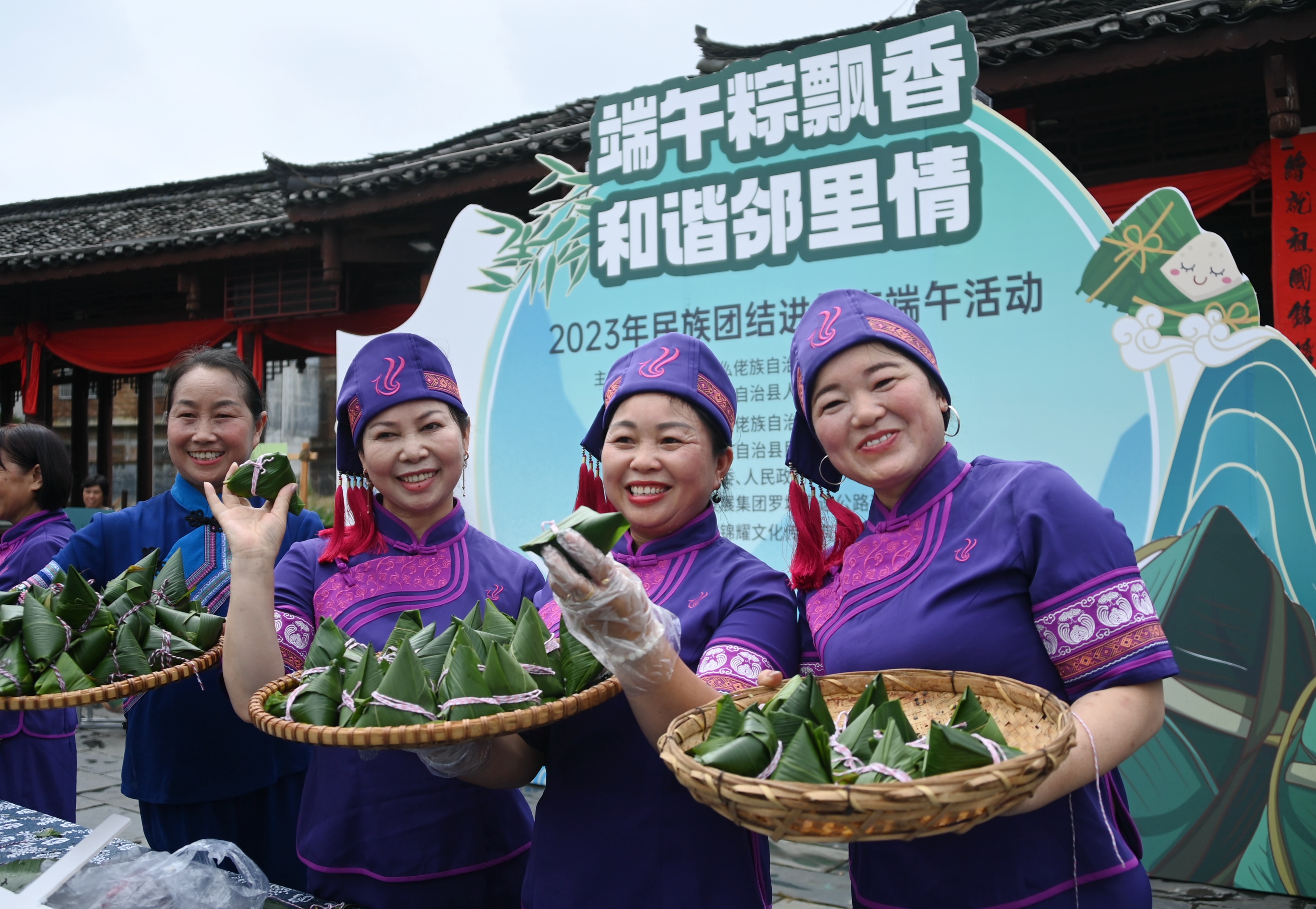 6月20日,在广西罗城仫佬族自治县东门镇石围古村举行的“端午粽飘香,和谐邻里情”活动中,人们展示包好的粽子。新华社发(蒙增师 摄)
