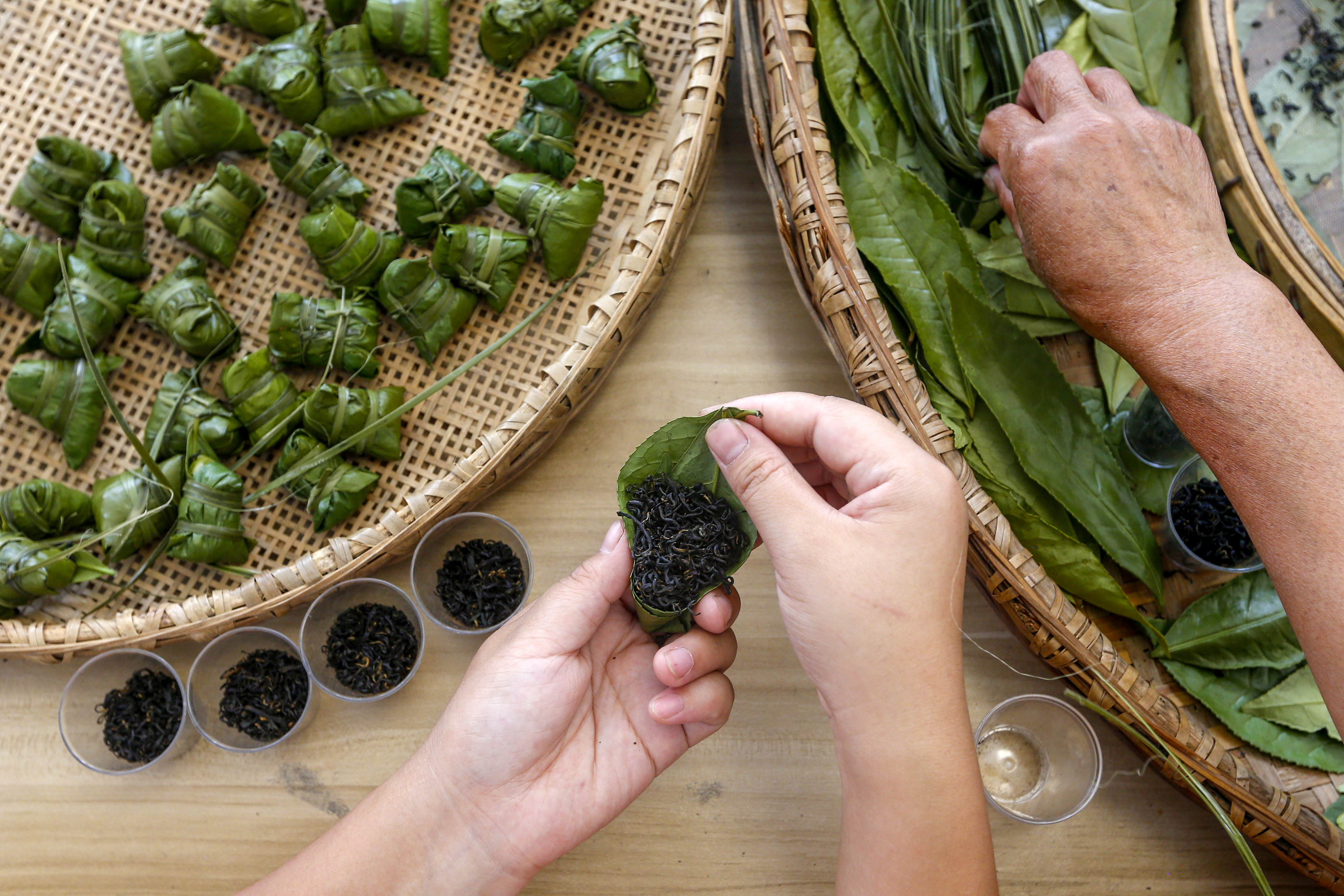 6月14日,在安徽省黄山市祁门县平里镇平里村,茶工把祁门红茶作为“馅料”,用传统包粽子的手法制作“粽茶”。新华社发(施亚磊 摄)