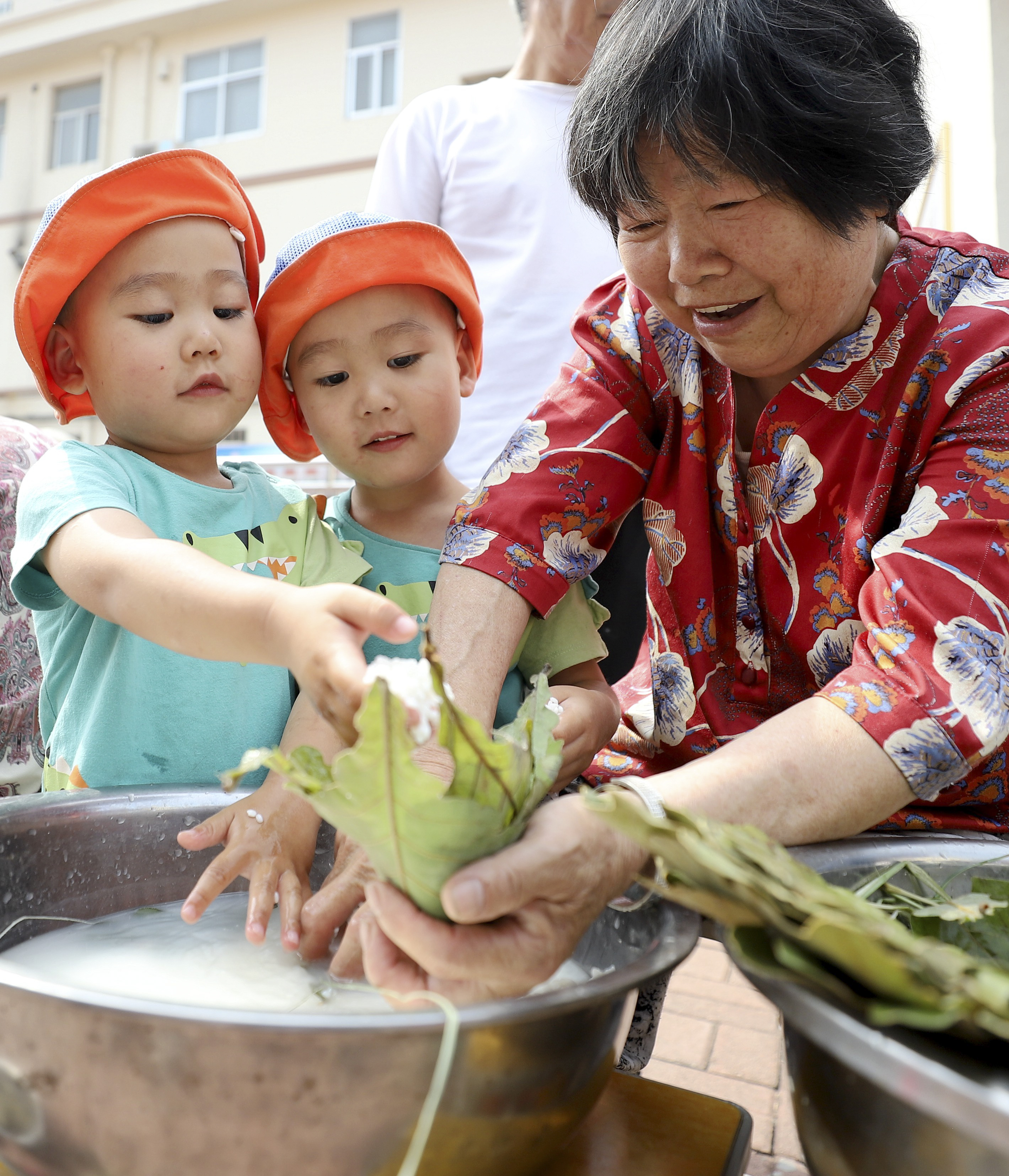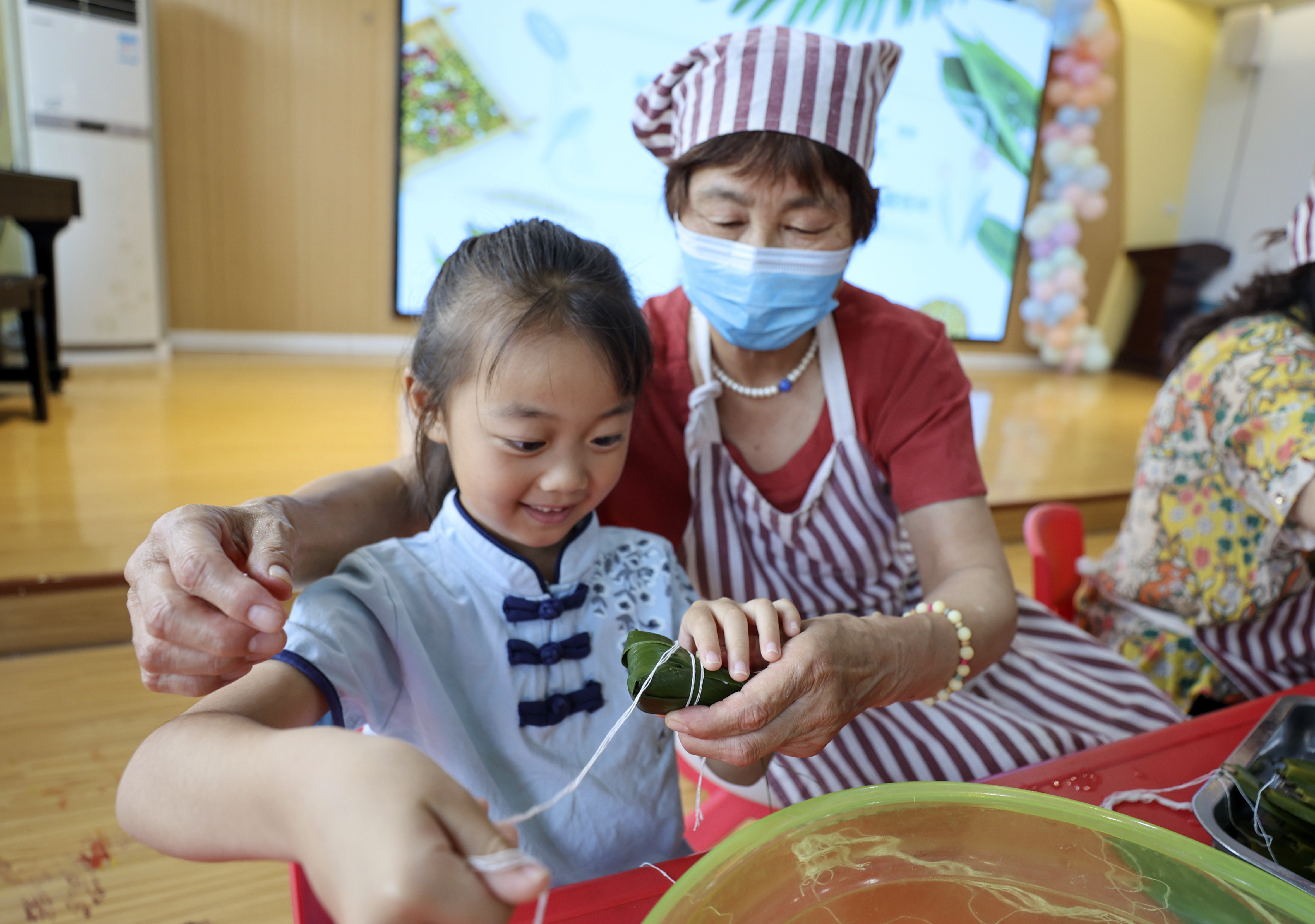 6月20日,在河南省开封市新街口幼儿园,家长跟小朋友一起制作粽子。新华社发(石斐 摄)