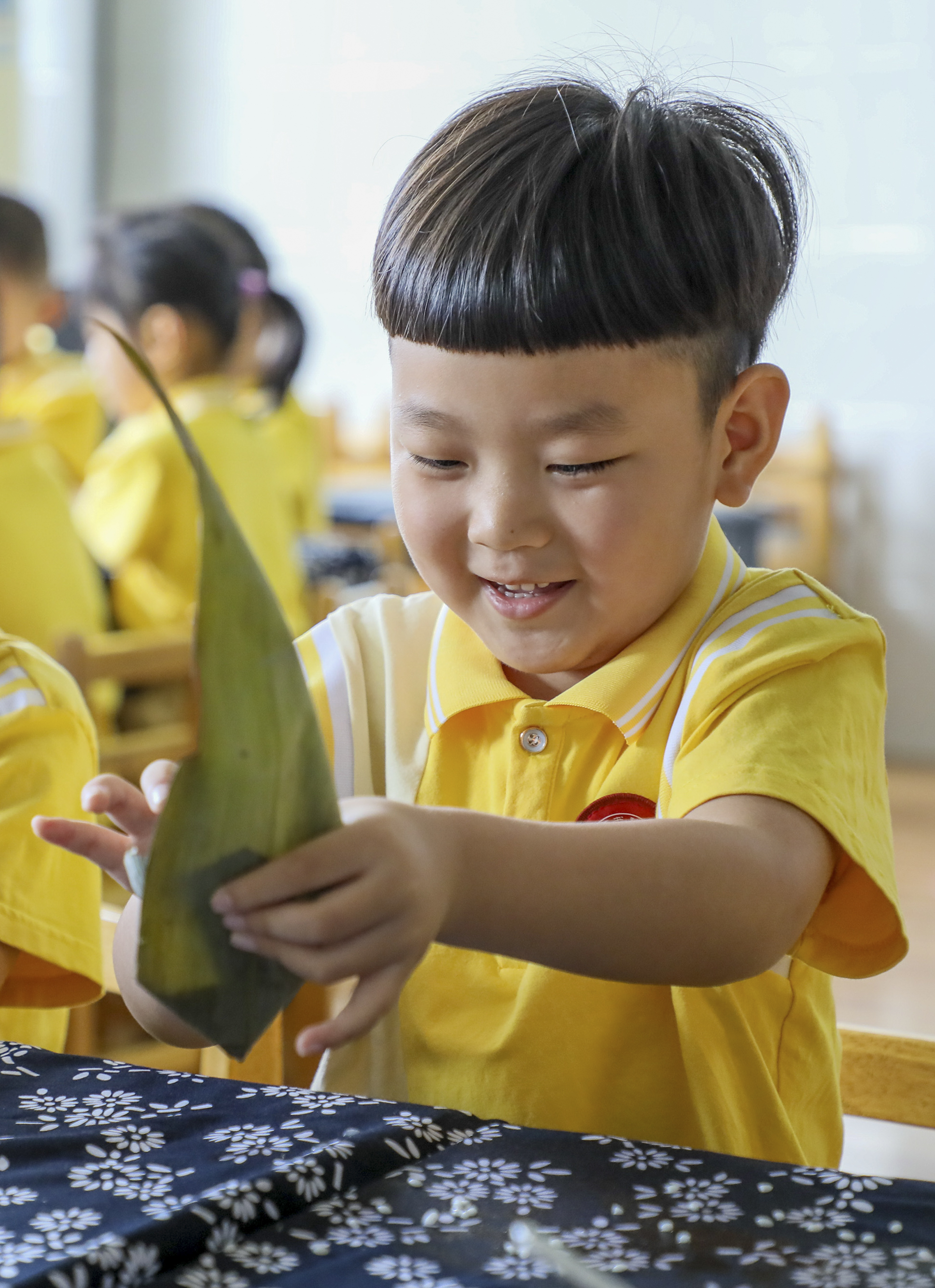 6月20日,山东省滕州市书院小学幼儿园的小朋友学习包粽子。新华社发(宋海存 摄)
