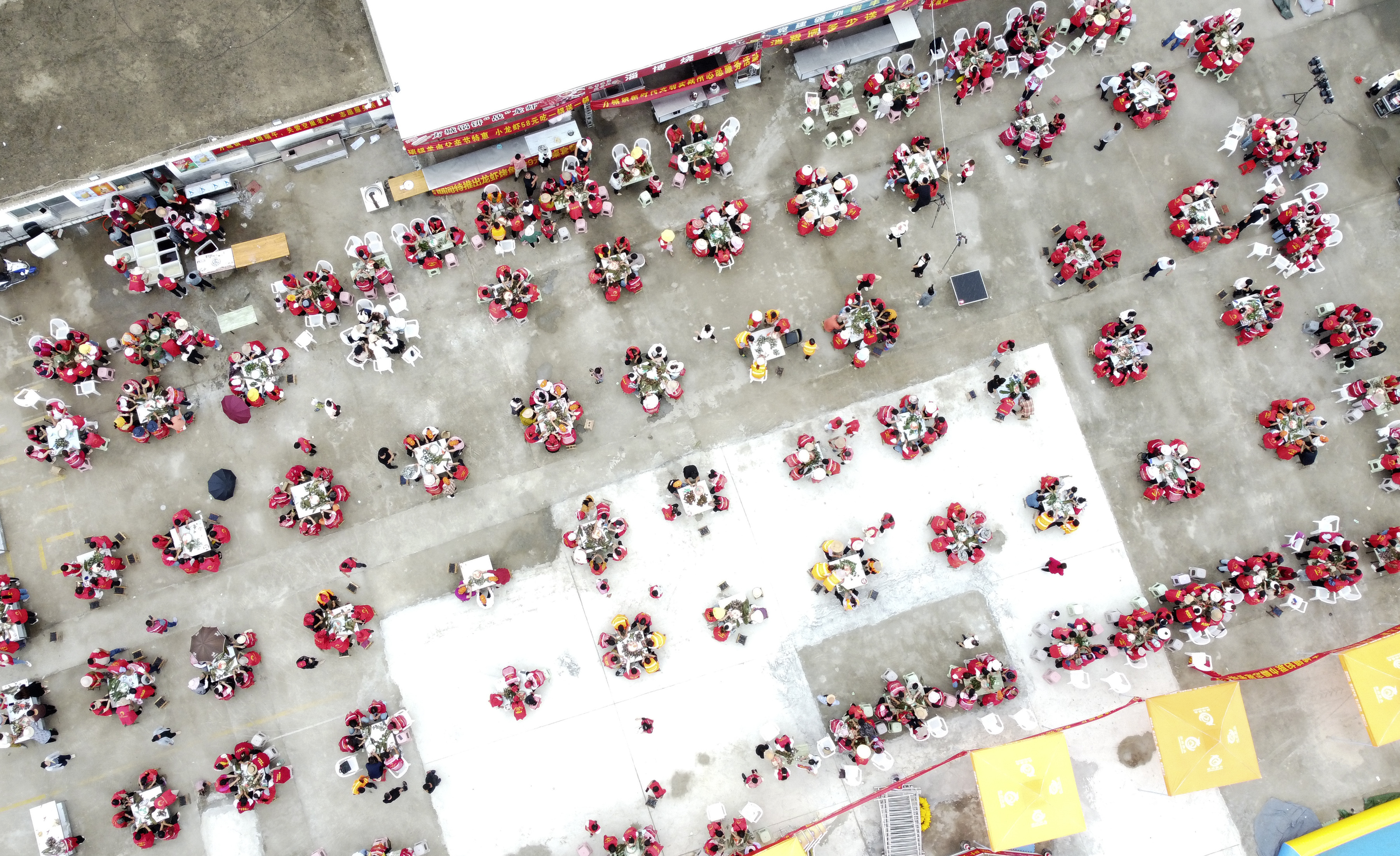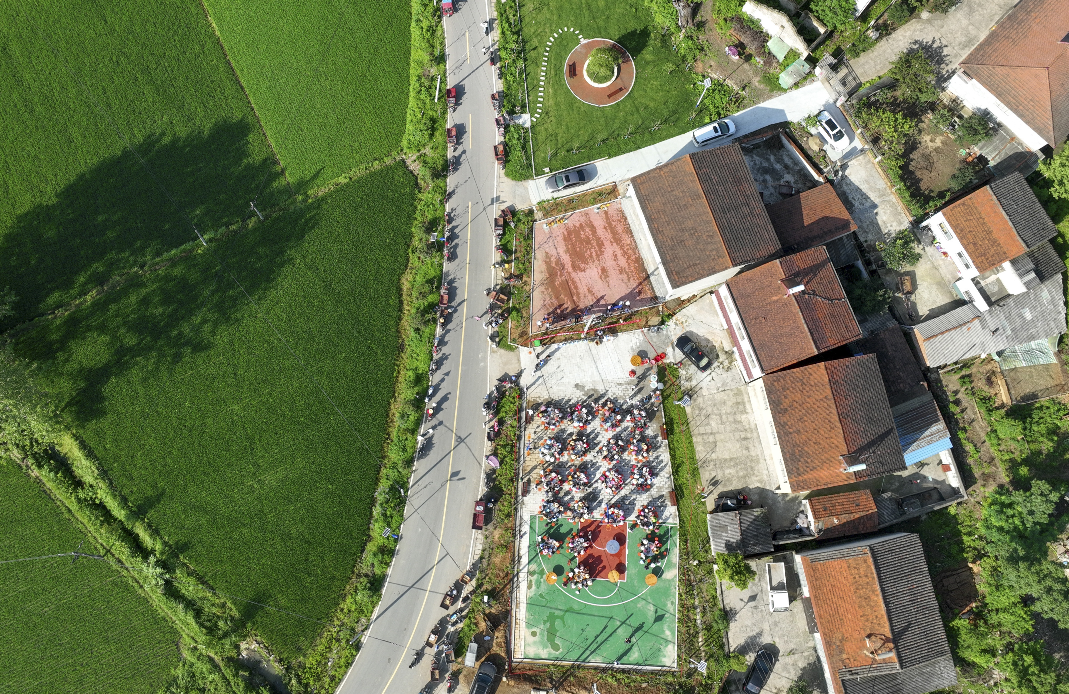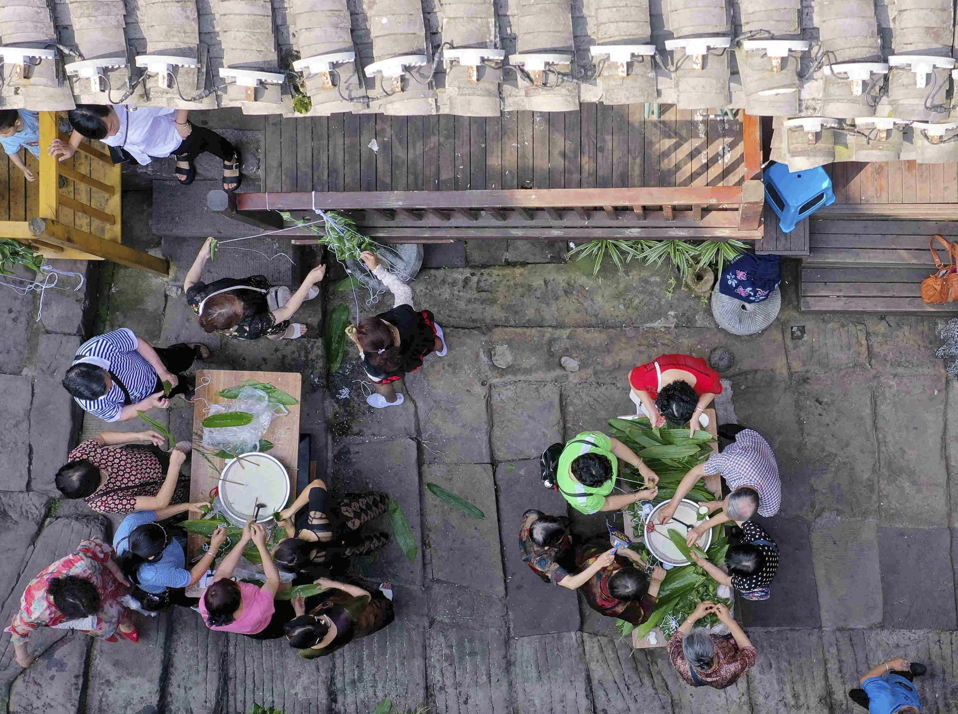 6月20日,贵州省赤水市市中街道滨江社区居民参加包粽子比赛(无人机照片)。新华社发(苟炼炜 摄)
