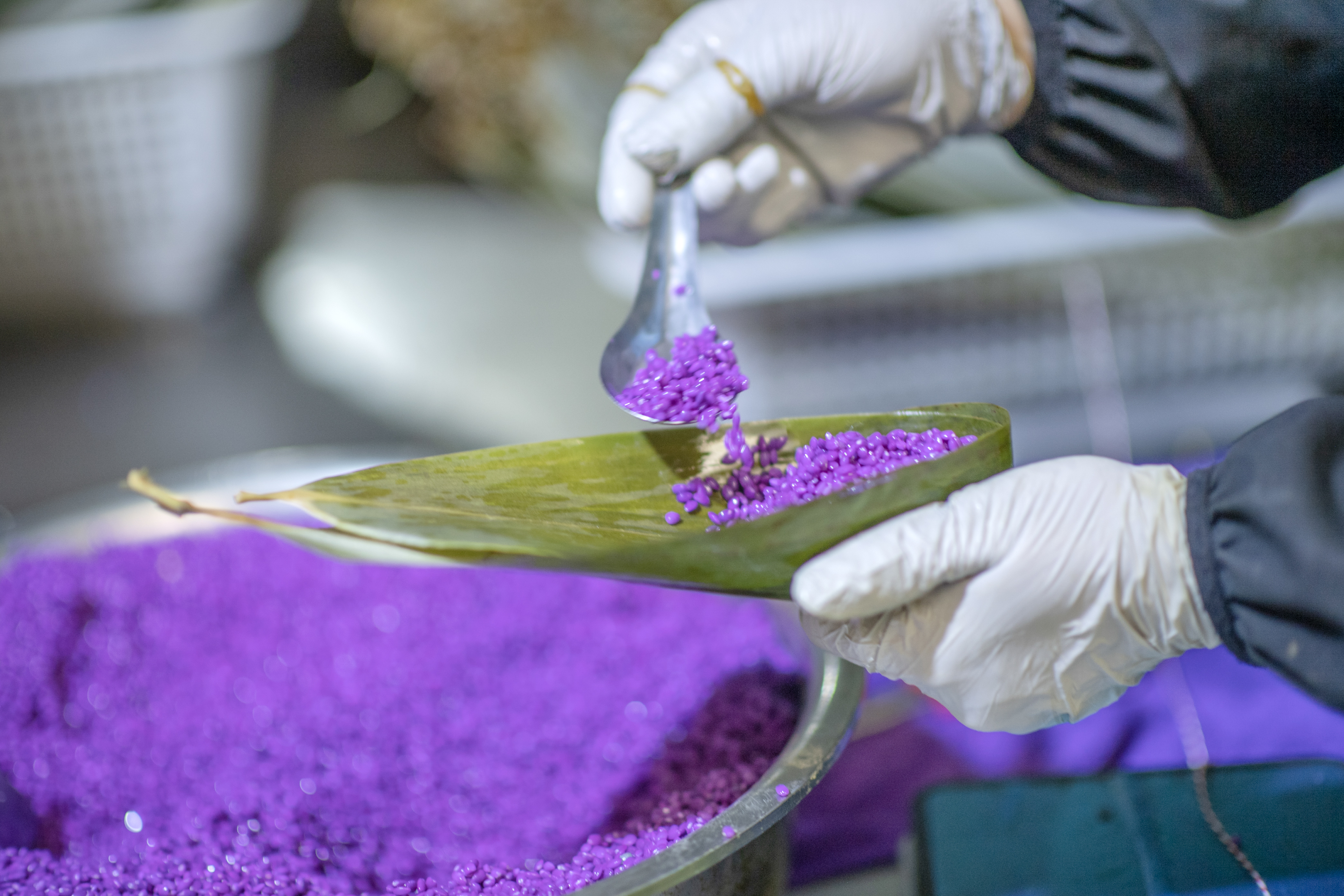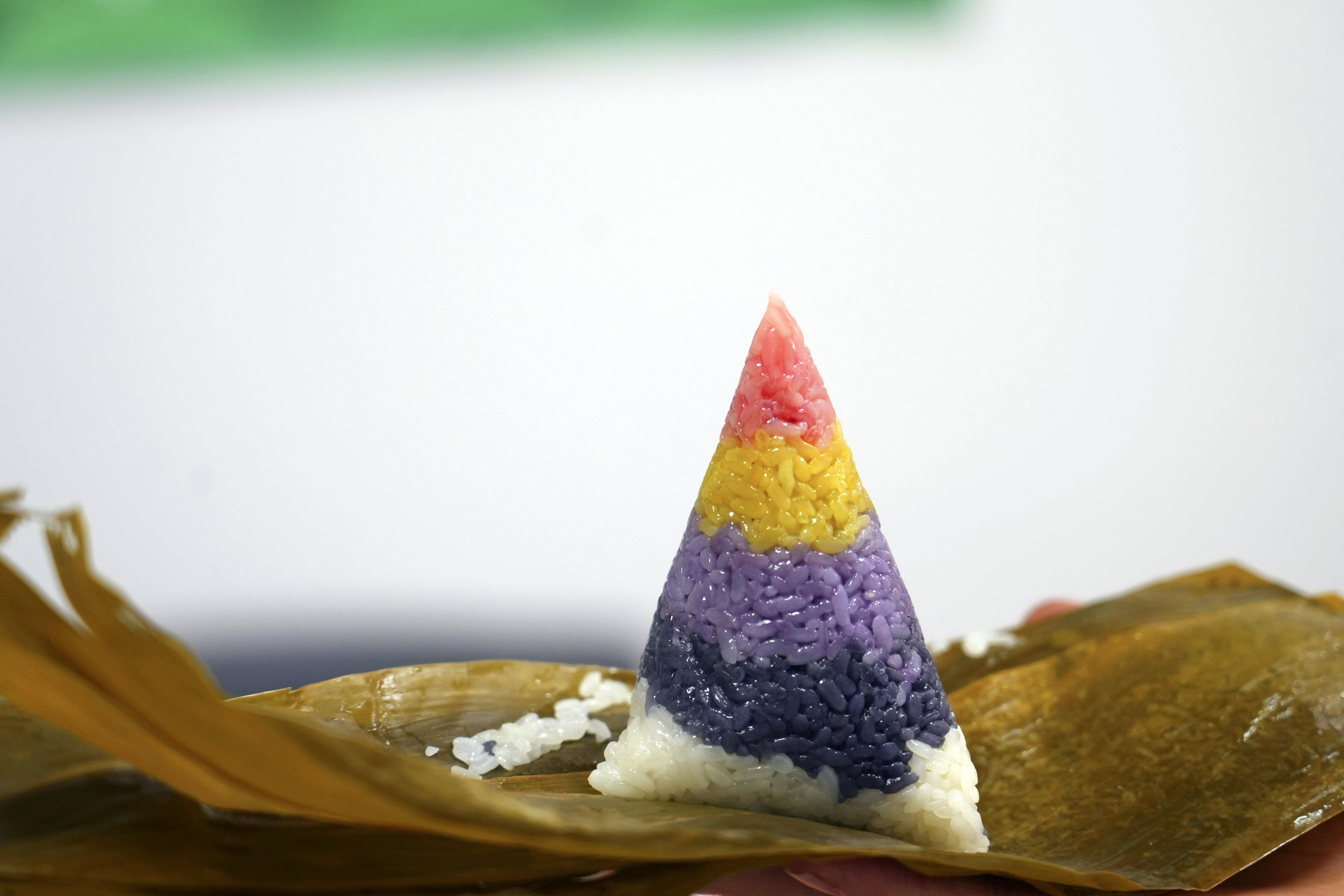 6月15日在贵州省黔东南苗族侗族自治州台江县排羊乡的一处粽子生产车间里拍摄的五彩粽子。新华社发(邰春 摄)
