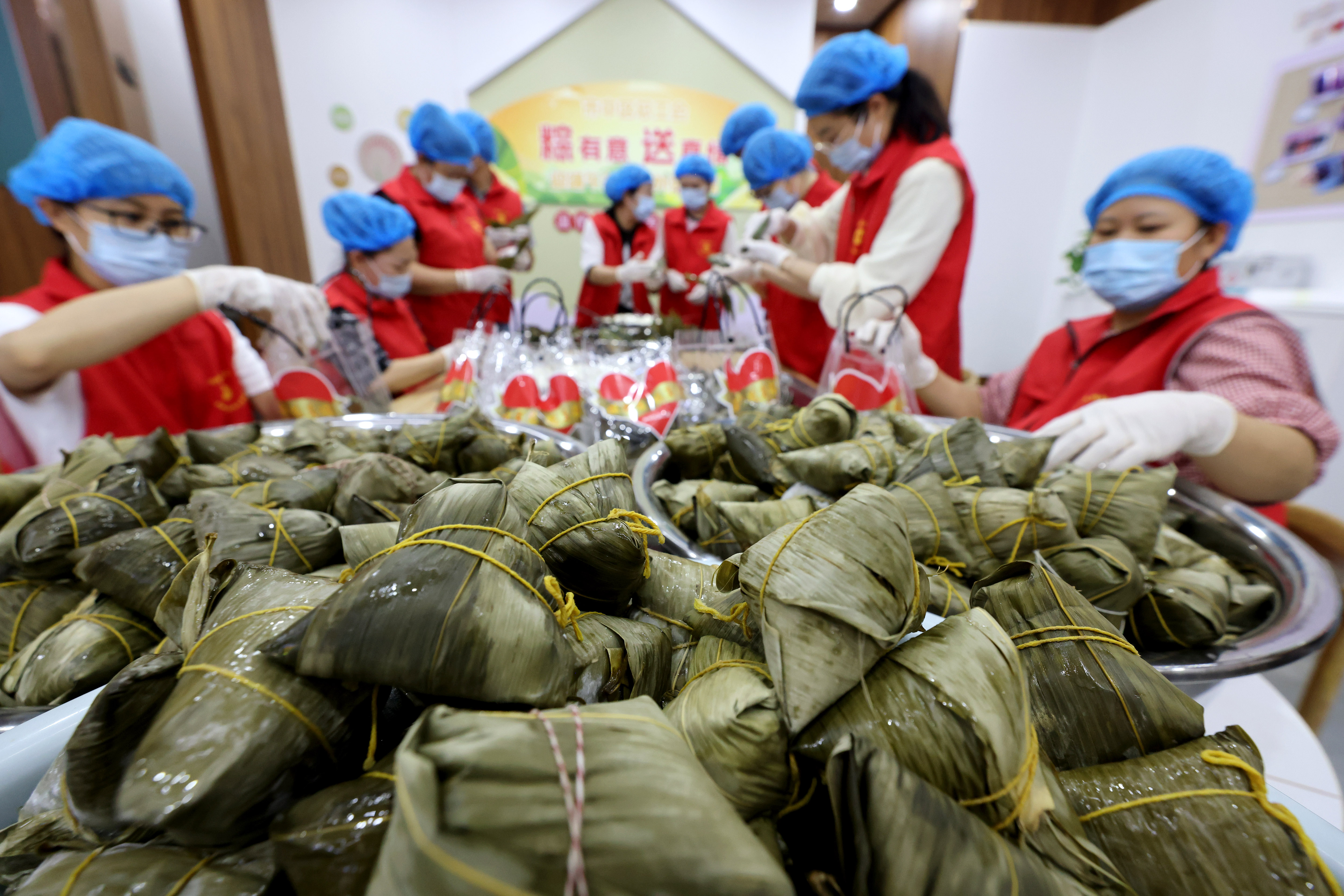6月18日,在山东省枣庄市市中区总工会“户外劳动者驿站”,工会志愿者为户外劳动者包粽子。新华社发(孙中喆 摄)