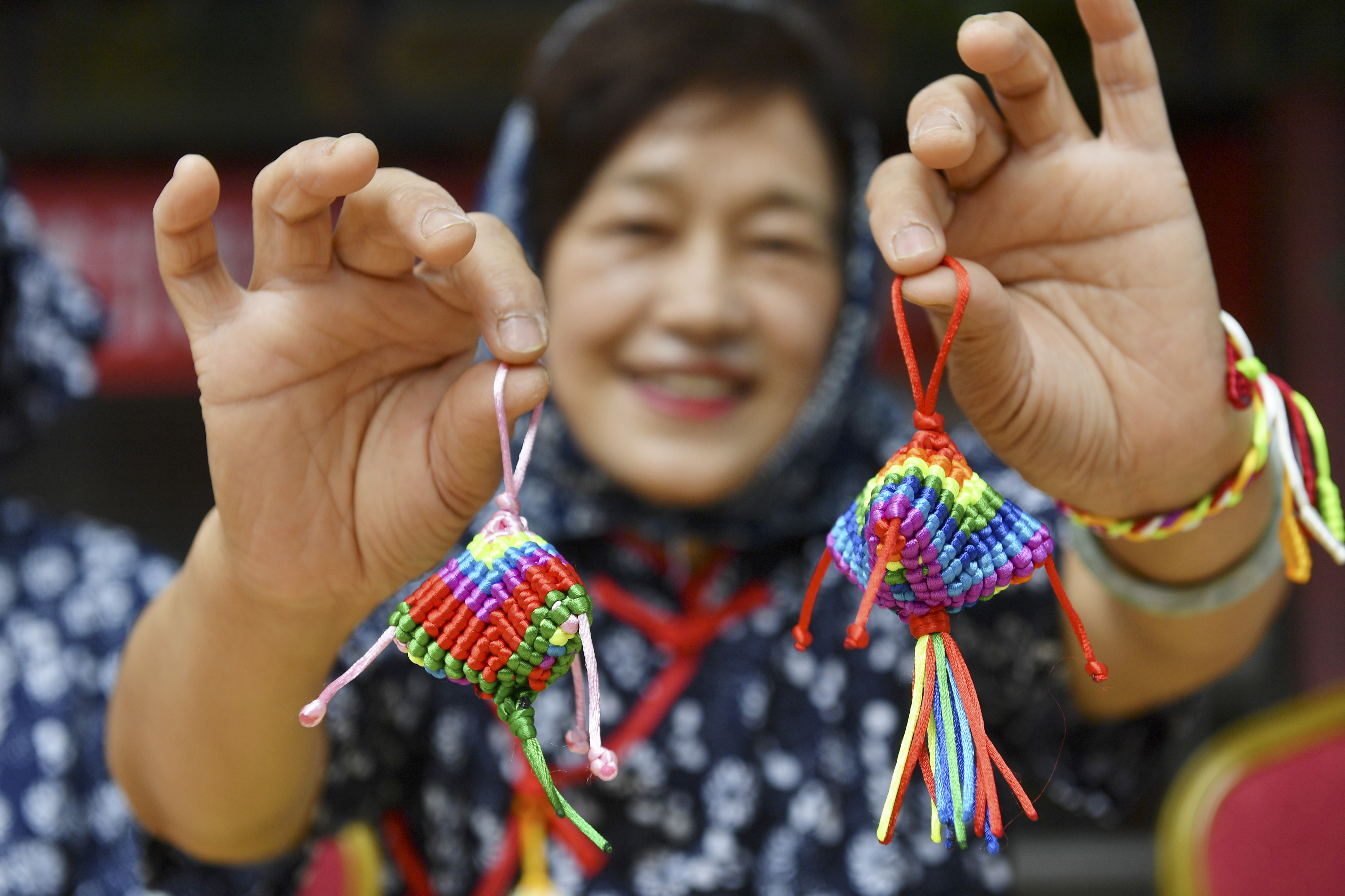 6月20日,在山东省青岛市城阳区红岛街道韩家民俗村,村民展示传统手编彩粽。新华社发(王海滨 摄)