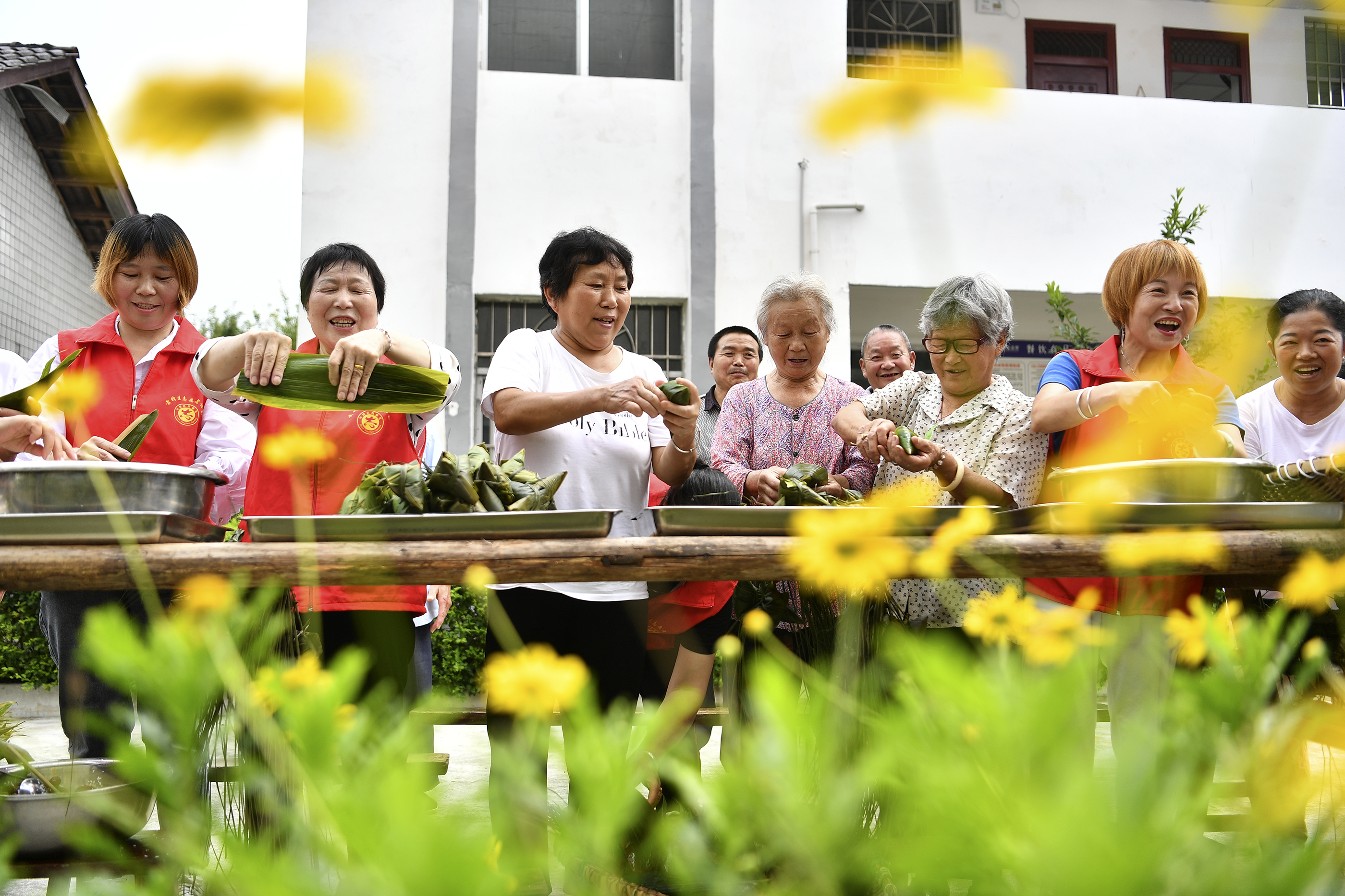 6月20日,四川省广安市前锋区志愿者在观阁镇敬老院与老人们一起包粽子迎端午。新华社发(张启富 摄)