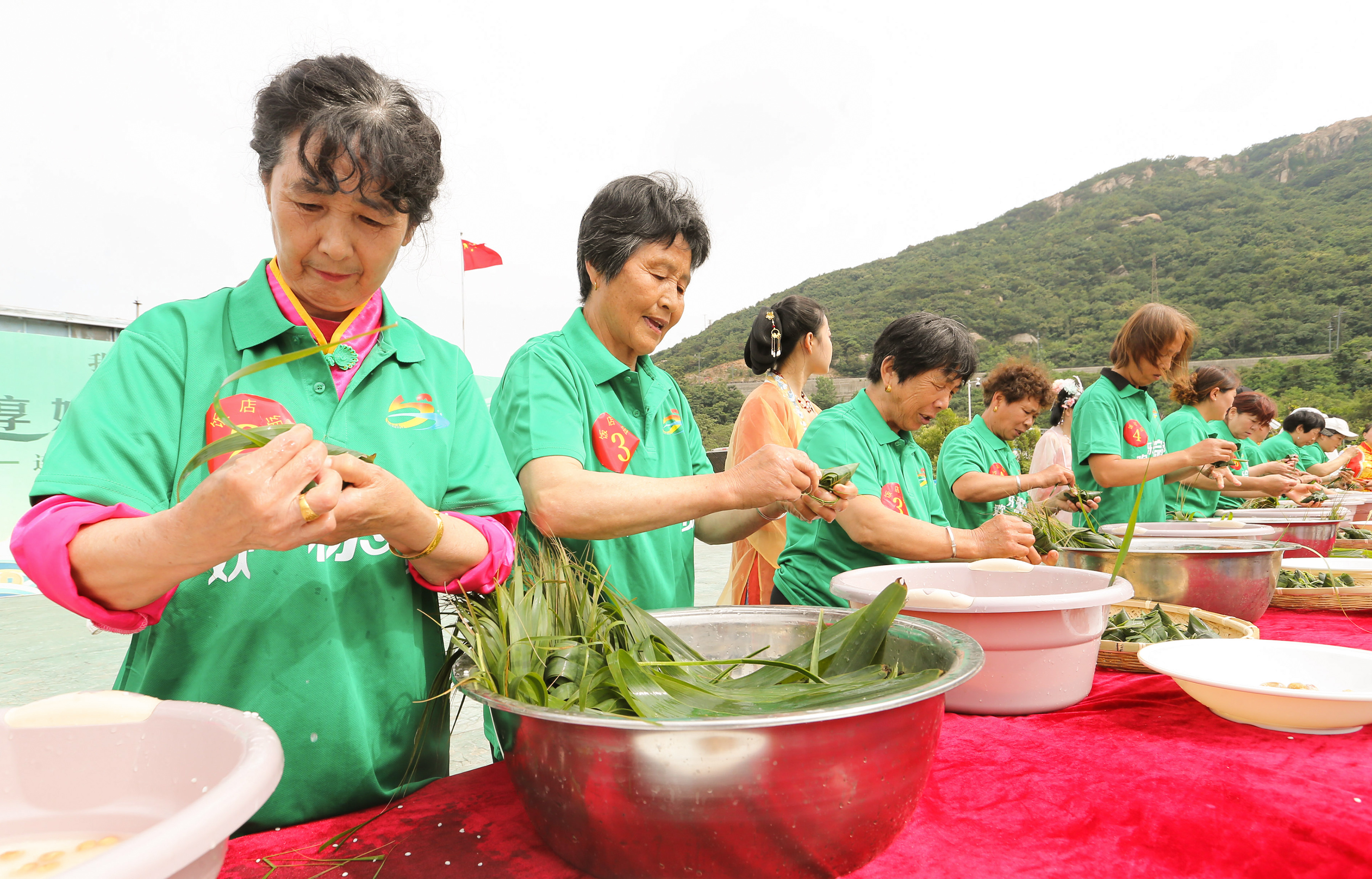6月18日,在江苏连云港市连云区高公岛凰窝风景区,人们在端午民俗文化活动上参加包粽子比赛。新华社发(王健民 摄)