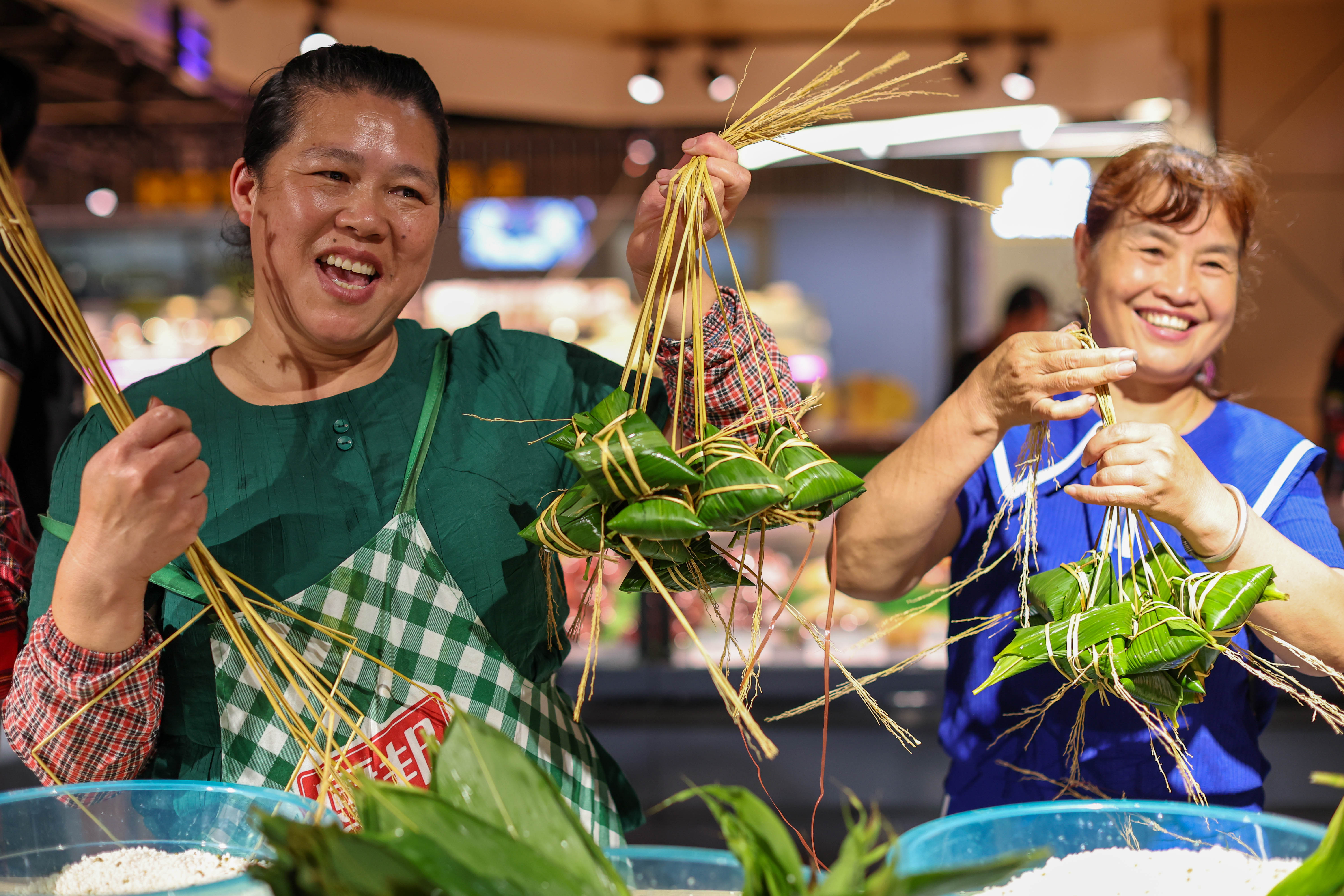 6月17日,在贵州省黔西南布依族苗族自治州册亨县举行的“盛夏赋雅趣,锦绣满粽香”端午节活动中,居民在包粽子。新华社发(刘朝富 摄)