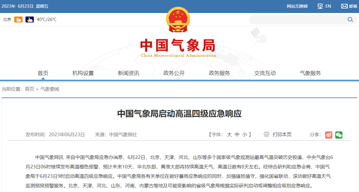 来自中国气象局应急办消息,6月22日,北京、天津、河北、山东等多个国家级气象观测站最高气温突破历史极值,中央气象台6月23日06时继续发布高温橙色预警,预计未来10天,华北东部、黄淮大部将持续高温天气,高温日数有8天左右。经综合研判和应急会商,中国气象局于6月23日9时启动高温四级应急响应。
